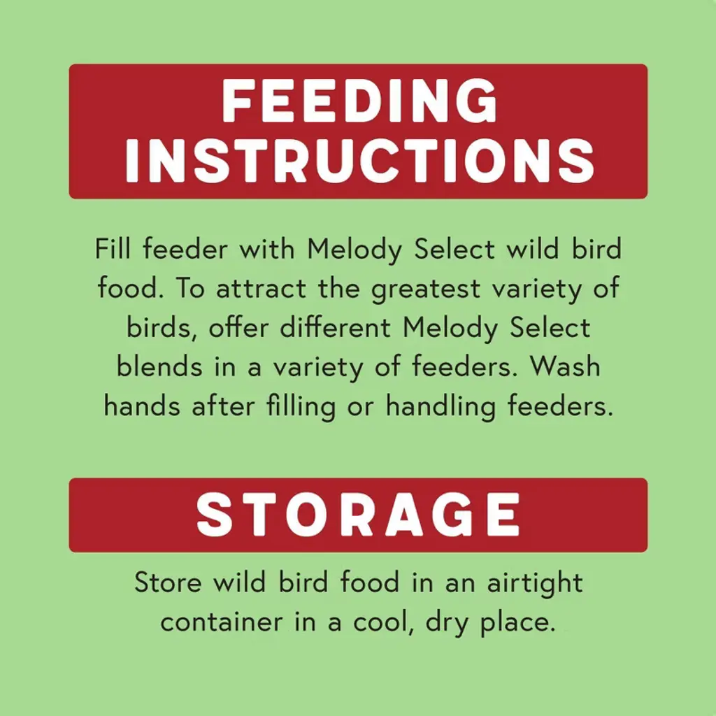 Melody Select Nut, Fruit & Berry wild bird food is packed full of seeds, nuts, and 100% real fruit to entice a variety of nut- and fruit-loving birds to your backyard. This hearty blend combines delicious peanuts and chunky mixed nuts, savory sunflower seeds, and sweet raisins, papaya, and cherries for a high-protein, high-energy, protein-packed meal that birds love to eat.