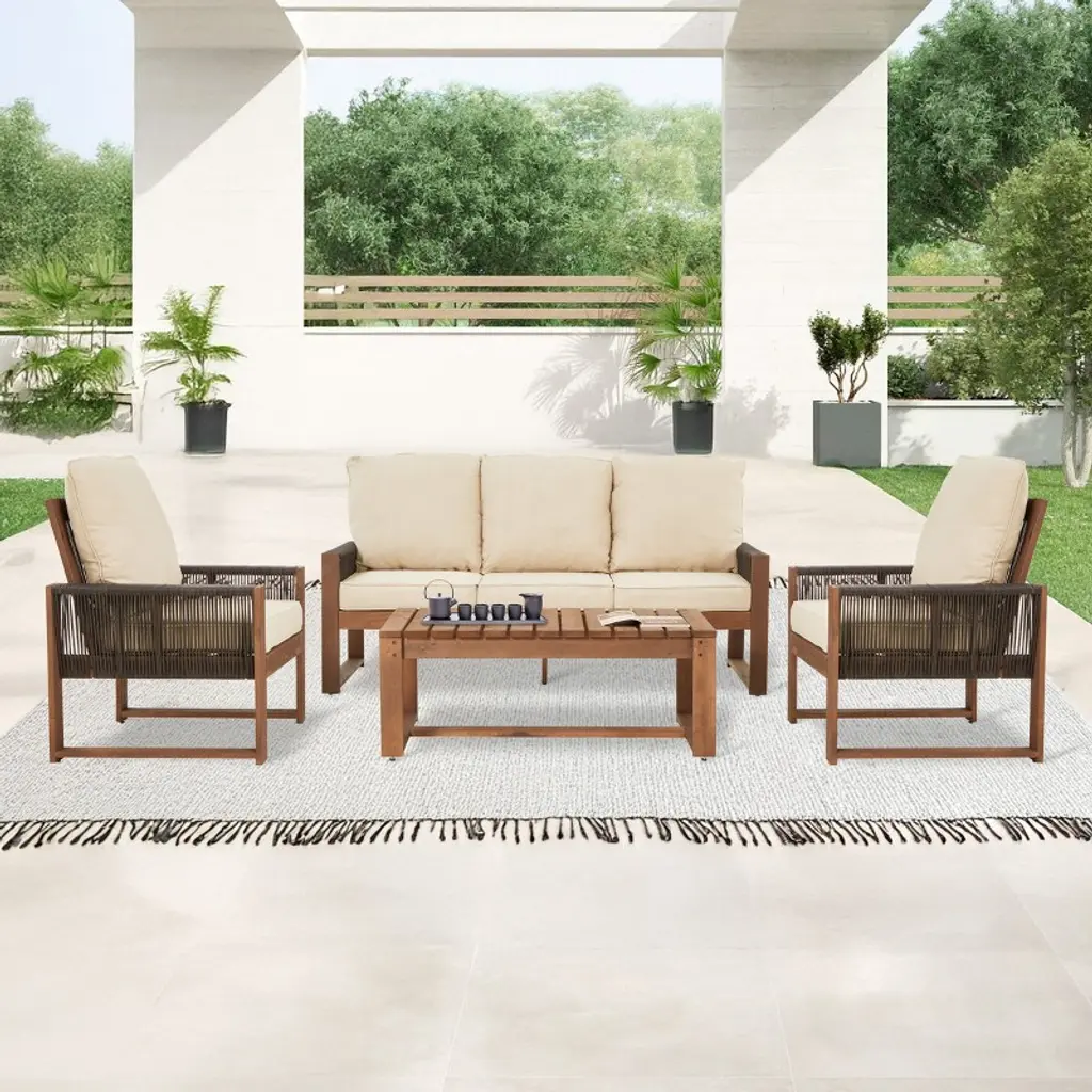 Prep your backyard for casual gatherings with this 5-piece conversation set, which includes a sofa, loveseat, armchair, coffee table, and side table. Each item is made from solid teakwood in a natural finish that brings an inviting bit of rustic charm to your outdoor space. It also comes with thick cushions and toss pillows that are designed for comfort and stand up to the elements. Plus, the machine-washable covers make cleaning a breeze.