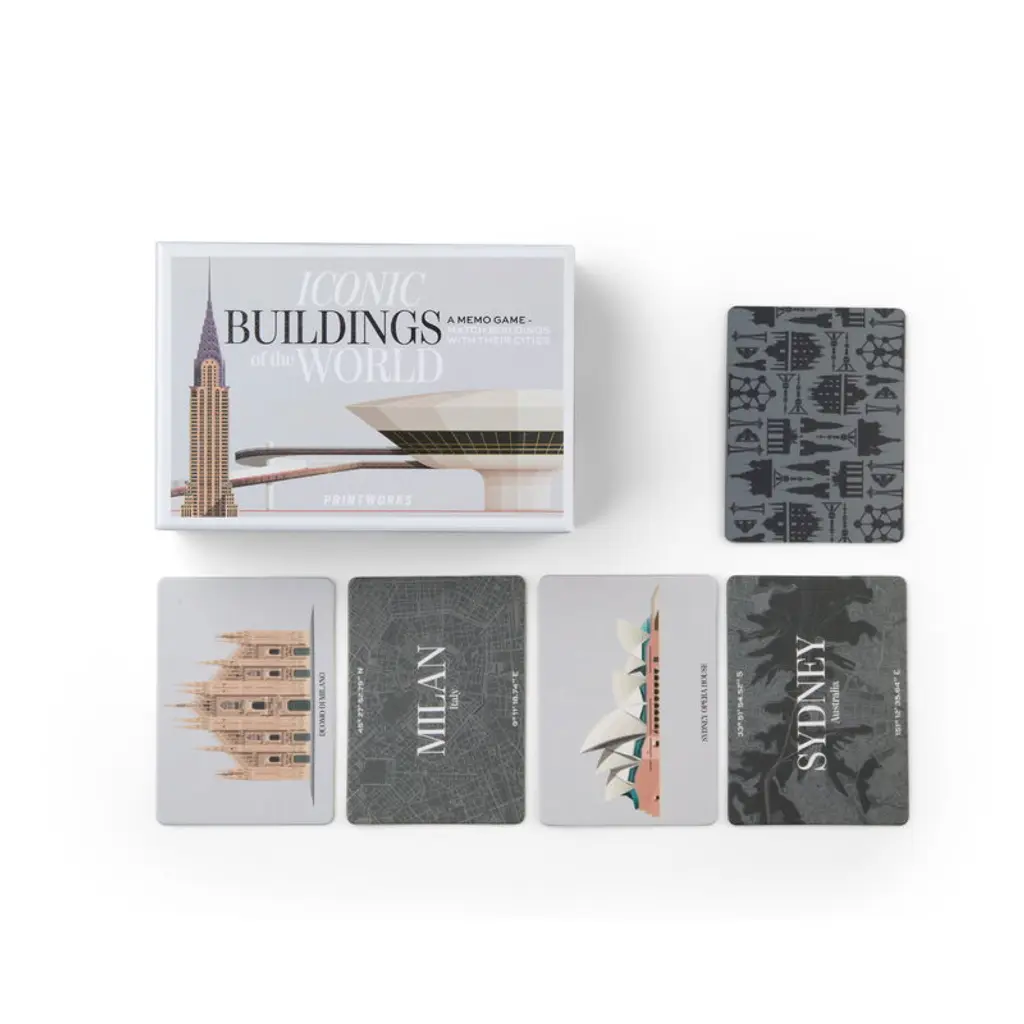 Printworks' Iconic Buildings memory game will take you on an armchair journey that will tickle your fancy. The game will challenge both your memory and your knowledge as you try to match the 25 famous buildings in the game with their cities. So pack your bags, sharpen your memory and let the games begin! Iconic Buildings is part of the Printworks' Memo Game series. The collection includes memory games for culture and geography lovers alike. The games are packaged in a stylish box and the cards are printed on durable, acid-free paper. The playful board games are a great gift idea and a fun way to spend time together with friends and loved ones.