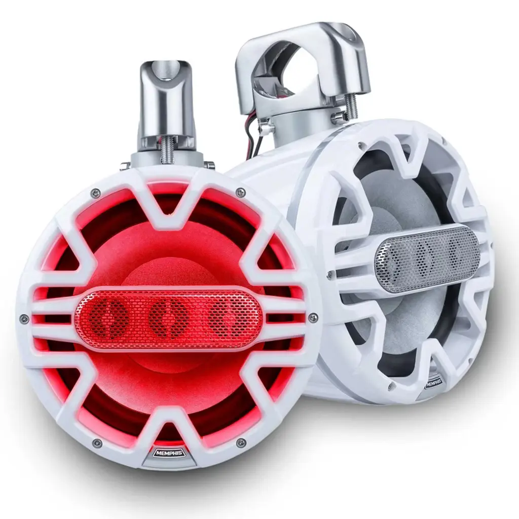 Enhance your outdoor audio experience with this Memphis Audio bundle, featuring the MM84TCVR 8" outdoor covers for MM84T tower speakers and the MM84TW 8" tower speakers in white. The MM84TCVR covers safeguard your investment from the sun and elements with an attached handle for easy transportation and storage. Designed for MM84TB and MM84TW, these covers offer convenient protection for your speakers. The MM84TW tower speakers boast Advanced Tower Array Construction (ATAC™) technology, revolutionizing tower speaker design with a curved tweeter array for superior sound quality and durability. Unlike traditional compression horn speakers, the ATAC™ design maximizes woofer output and mid bass while ensuring a fully sealed enclosure for marine and saltwater applications. The 3-tweeter line array delivers unrivaled clarity and output at any angle, making it ideal for boating enthusiasts. Key features include RGB lighting, cast stainless steel brackets (fitting 1.75-3” bars), 360-degree swivel brackets, surface mount brackets, ASA plastic enclosure, sealed electrical connections, IP66 rating, stainless steel array grille, 200W RMS/400W PEAK output, and shadow black finish. With dimensions of 12.5" H, 9" W, and 11.9" D, these speakers are designed for versatility and performance. Experience the next level of outdoor audio entertainment with this Memphis Audio bundle, combining protection and innovation to elevate your sound system to new heights. Ideal for marine applications and outdoor use, these tower speakers are designed to deliver powerful, crystal-clear sound while enduring the elements with style and reliability. Upgrade your outdoor audio setup with Memphis Audio's cutting-edge technology and sleek design.