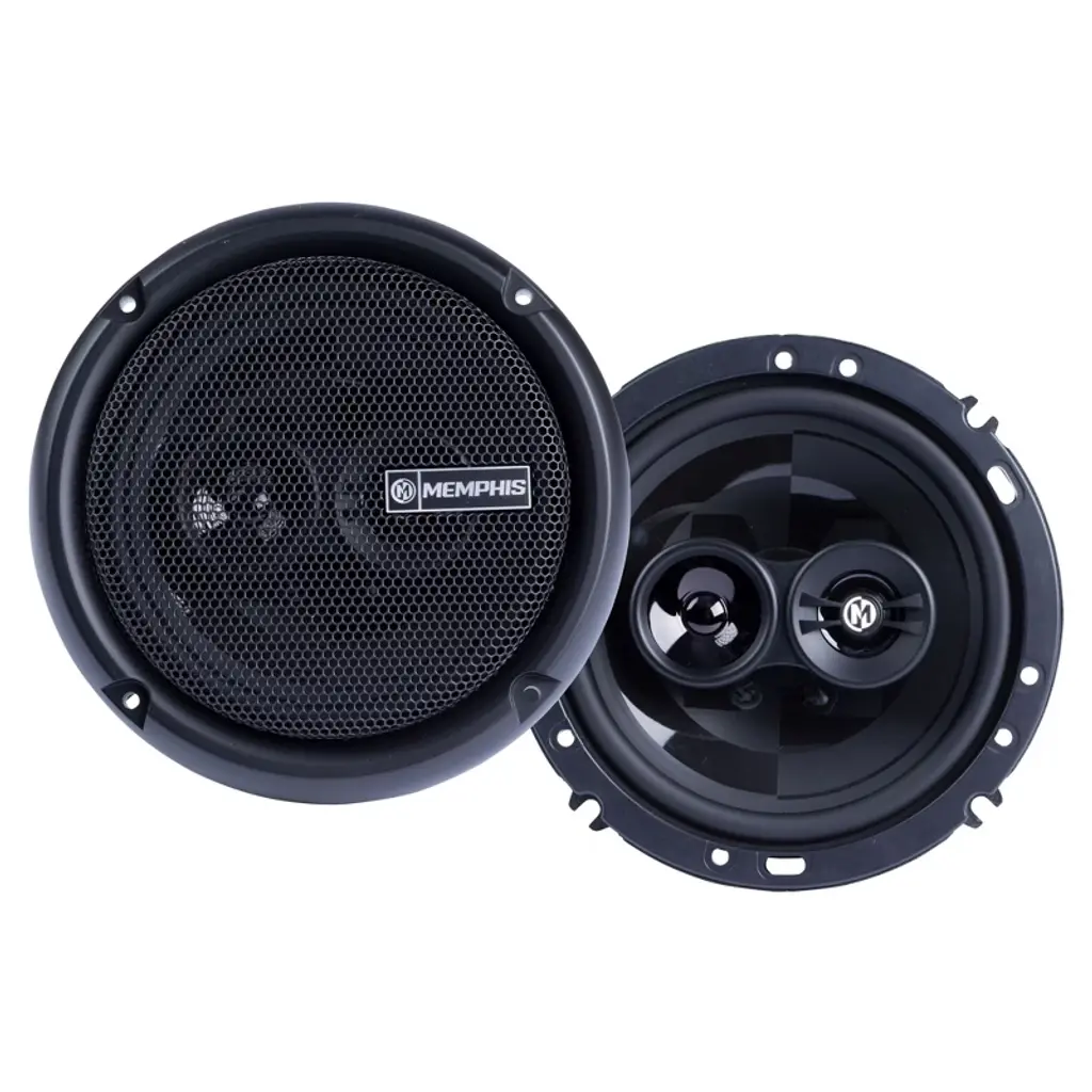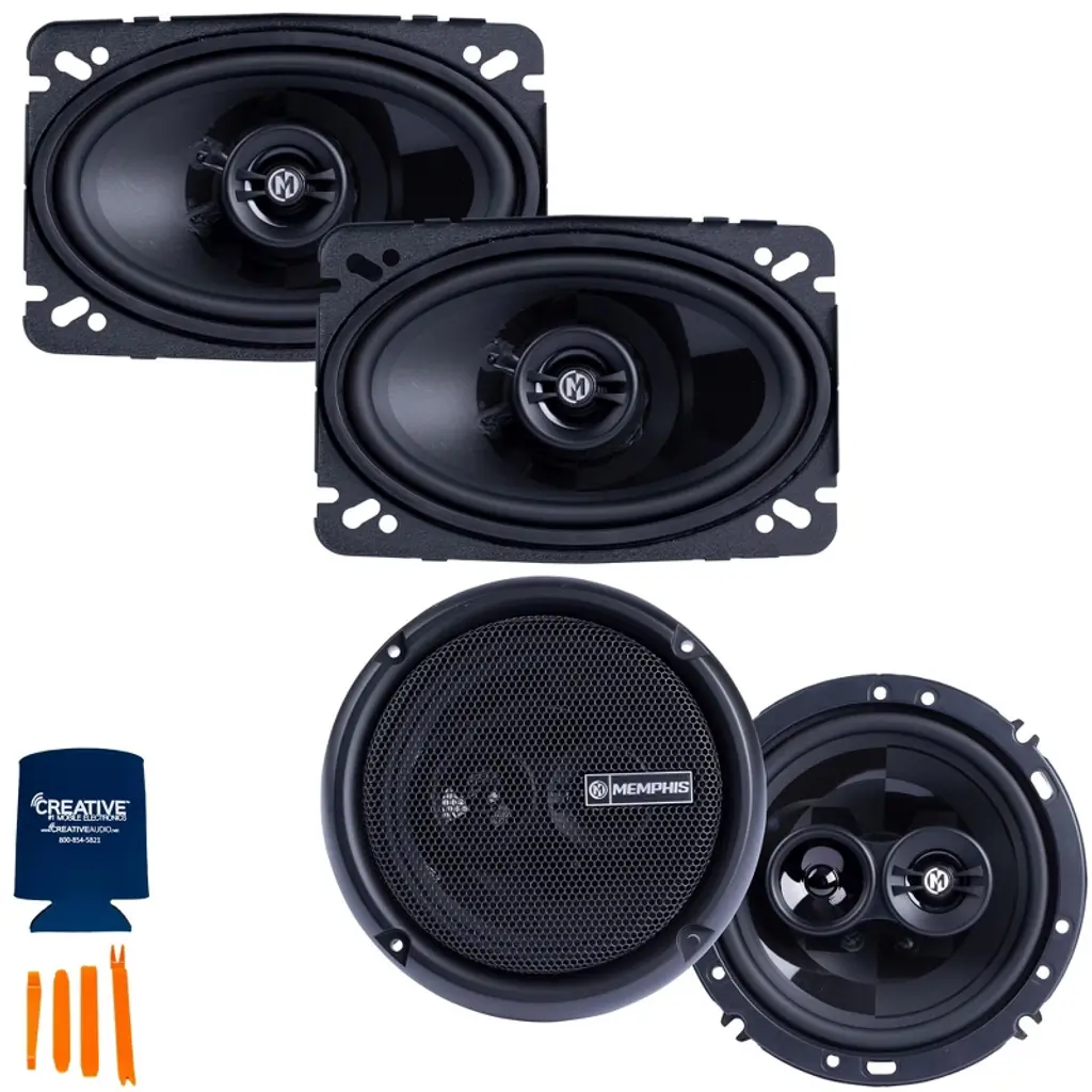 Memphis Audio 1 Pair of PRX5 5.25" Coaxial Speakers and 1 Pair of PRX603 6.5" 3-Way Coaxial Power Reference Series Speakers - This bundle includes a pair of Memphis Audio PRX5 Power Reference Series 5.25" 2-Way Coaxial Speakers With Swivel Tweeters, a Memphis Audio PRX603 Power Reference Series 6.5" 3-Way Coaxial Speakers With Swivel Tweeters, a pry kit, and a Creative Audio coozy. Memphis Audio PRX5 Power Reference Series 5.25" 2-Way Coaxial Speakers With Swivel Tweeters - Pair Features: • Polyurethane surround • PEI dome tweeter • Multi-direction pivot tweeter system • Stealthy black-on-black M-Cone design Specifications: • Size (in) 5.25" • RMS Power (w) 30 • Peak Power 60 • Sensitivity (dB) 87 • Mounting Depth (in) 2.125 • Magnet Size (oz) 10 • Warranty 1 year • Grill included Memphis Audio PRX603 Power Reference Series 6.5" 3-Way Coaxial Speakers With Swivel Tweeters - Pair Features: • Polyurethane surround • PEI dome tweeter • Multi-direction pivot tweeter system • Stealthy black-on-black M-Cone design Specifications: • Size (in) 6.5" • RMS Power (w) 50 • Peak Power 100 • Sensitivity (dB) 88 • Mounting Depth (in) 2.25 • Magnet Size (oz) 10 • Warranty 1 year • Grill included
