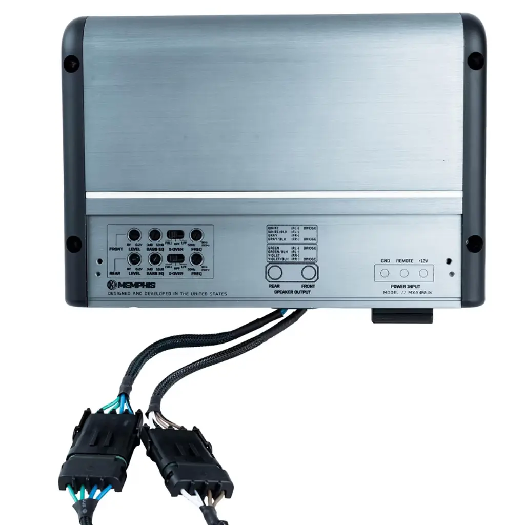 This bundle features 2 Memphis Audio MXA69L MXA 6x9" Marine Grade Coaxial Speakers w/RGB LED - Pair and a Memphis Audio MM500.4V 4-Channel Marine Amplifier, 125x4 at 2 Ohm. The Memphis Audio MXA69L speakers are designed for extreme environments, offering water and element resistance. With integrated RGB LED technology, these 6x9" speakers deliver excellent sound quality and deep bass, ideal for marine and outdoor applications. UV coated for sunlight protection and salt-tested for corrosion resistance, they come with both white and gunmetal protective grills. Key Features: - Water and element resistant - UV coated for protection - Swivel mount aluminum tweeter - Injection molded poly cone - Butyl rubber surround for durability - Integrated RGB LED lighting - Both white and gunmetal grills included Specifications: - Size: 6x9" - RMS Power: 60W - Peak Power: 120W - Sensitivity: 89dB - Mounting Depth: 3.27" - Magnet Size: 14oz - Warranty: 1 year The Memphis Audio MM500.4V Marine Amplifier is built to withstand marine conditions with IPX5 rating and sealed chassis. This 4-channel amp features sealed connectors, extruded aluminum heat sink, and protection circuitry against overload, short circuit, thermal issues, and reverse polarity. With features like LED light strip, variable bass boost, and fully variable crossover, it offers versatile and powerful performance. Key Features: - IPX5 Rated marine amplifier - Sealed connectors and chassis - Top mount controls - Signal sensing auto turn on - Variable bass boost and crossover - Protection against various issues - Extruded aluminum heat sink For a complete marine audio setup that delivers exceptional sound quality, durability, and ease of installation, this Memphis Audio bundle is the perfect choice. Elevate your marine audio experience with these high-performance speakers and amplifier.