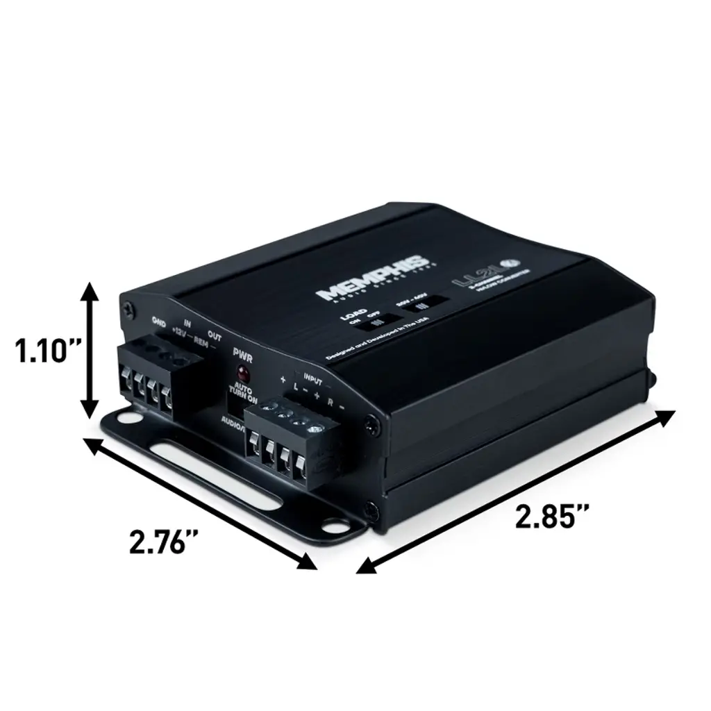 Get the ultimate audio integration solution with the Memphis Audio LL2L 2-Channel Line Output Converter bundle and elevate your car audio experience. The LL2L Converter ensures crystal-clear sound quality with low impedance outputs and differential balanced inputs, along with variable gain adjustment and LED clip indicator for precise tuning. Enjoy versatile power management options like selectable DC-offset or audio detect auto turn-on and a 12-volt remote output. The compact aluminum chassis with locking detachable terminals offers secure connections, while the high preout voltage of up to 11V guarantees distortion-free output. Enhance any system with OEM Load Detect compatibility and precise connections with panel mount RCA jacks. Dimensions: 2.76 x 2.85 x 1.10 inches. Experience peak audio performance with the Memphis Audio 4GKIT 4-Gauge Amp Install Kit featuring a quality ANL Fuse Holder complete with a 200A fuse. Made from 100% pure copper wire with true AWG ratings, this kit includes power and ground distribution blocks to maximize your audio system's output and enhance equipment longevity. The 17-foot ETP-17 RCAs ensure top-notch connectivity (RCA's NOT included). Upgrade your car audio setup with this professional-grade installation kit, guaranteeing a clean, powerful, and enduring connection that amplifies your listening pleasure. Elevate your car audio game with Memphis Audio today!