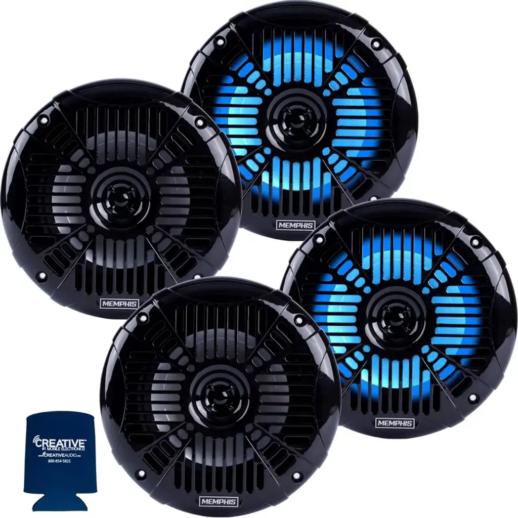 Memphis Audio LED Marine Speaker 6 Pack MXA60L 6.5" Marine Grade, Included Black and White Grills With RGB LED - 3 Pair- This bundle includes a 3 pairs of the Memphis Audio MXA60L MXA 6.5" Marine Grade Coaxial Speakers w/RGB LED - Pair, and a Creative Audio coozy. Memphis Xtreme Audio speakers are designed to perform in rugged conditions that demand extra element and water protection. Boats, Side-by-sides, trucks whatever your application, MXA speakers will continue to perform no matter what you throw at them. Bring the party anywhere the road takes you with MXA Audio. MXA60L speakers are water and element resistant and designed to perform in extreme environments. From boats, to powersports equipment to off-road vehicle, These 6.5" speakers provide amazing sound and deep bass even in open air environments. MXA gear is UV coated to withstand the harsh sunlight for long days on the lake or trails and are salt tested for corrosion for ocean applications. The MXA60L ships with protective grills in both gunmetal and white with removable protective mesh inserts. Each set of MXA60L speakers features integrated RGB LED technology to bring your equipment to life when the sun goes down. Features: • Both gunmetal and white grills ship standard with speakers • Grills designed to house optional LEDSP2 RGB LED rings • Swivel mount aluminum tweeter • Injection molded poly cone • Butyl rubber surround • High temp abs composite basket • UV coated for ultraviolet light protection • Water and element resistant • RGB LED Lighting included in grills on "L" models Specifications: • Size (in) 6.5" • RMS Power (w) 50 • Peak Power 100 • Sensitivity (dB) 88 • Mounting Depth (in) 2.5 • Magnet Size (oz) 10 • Warranty 1 year • Grill included (1 White, 1 Gunmetal)