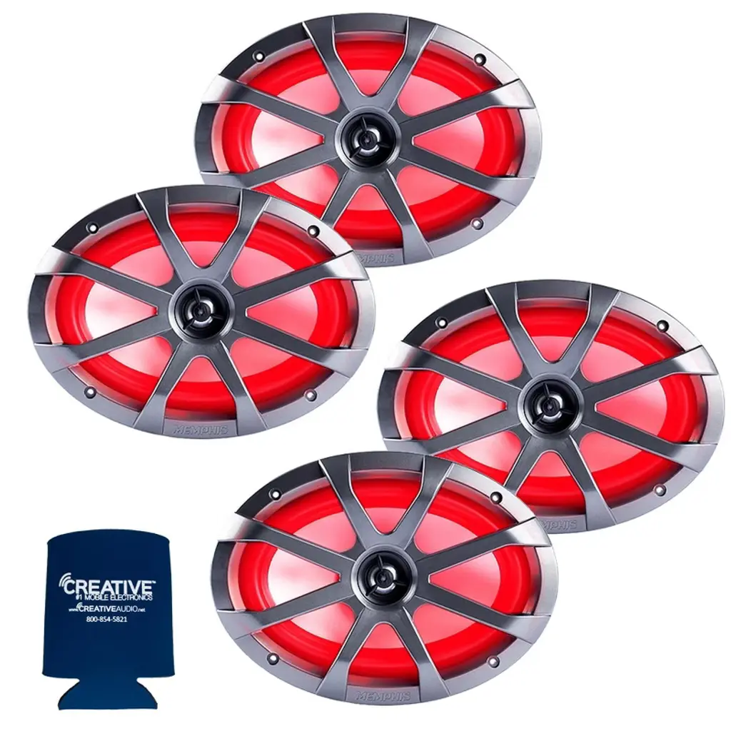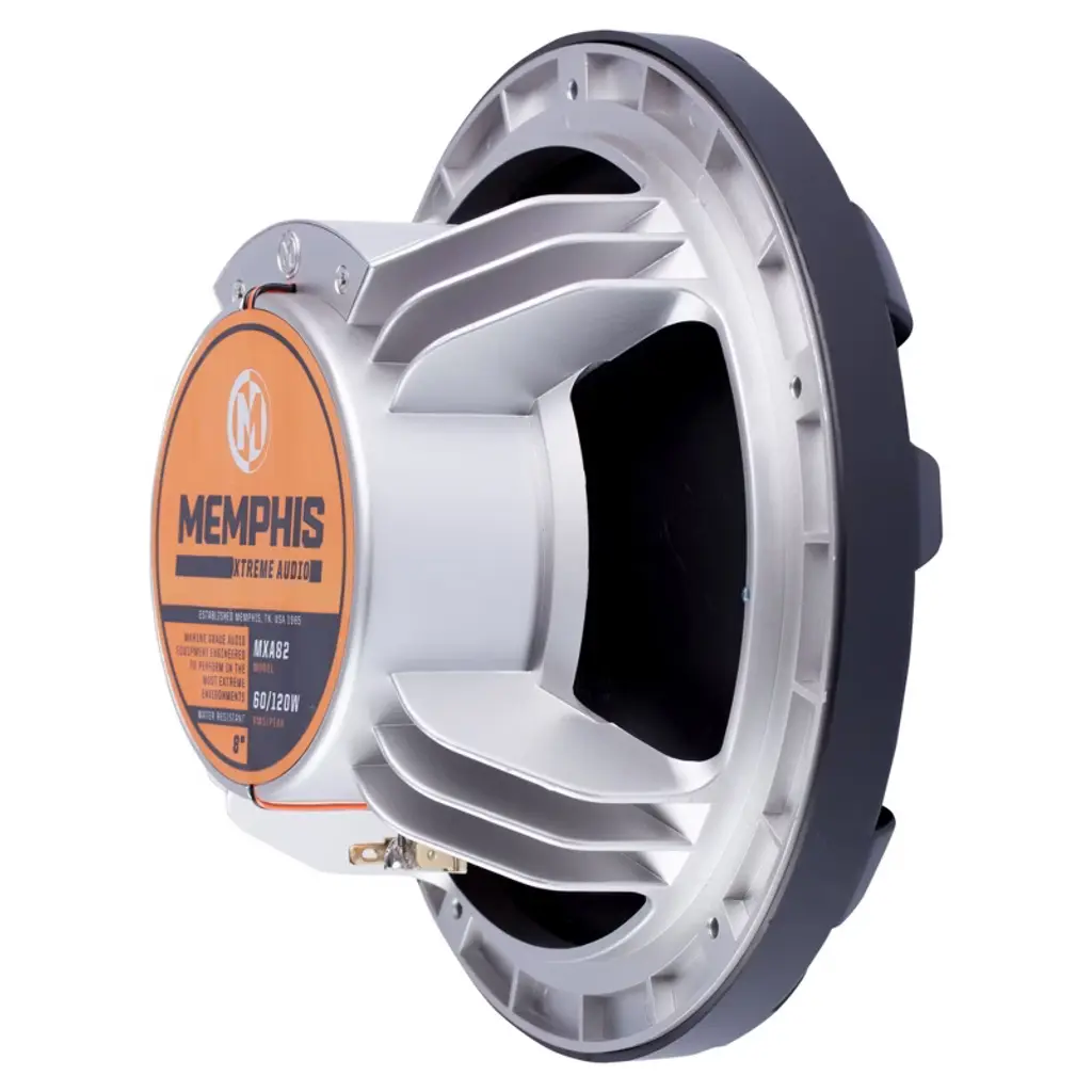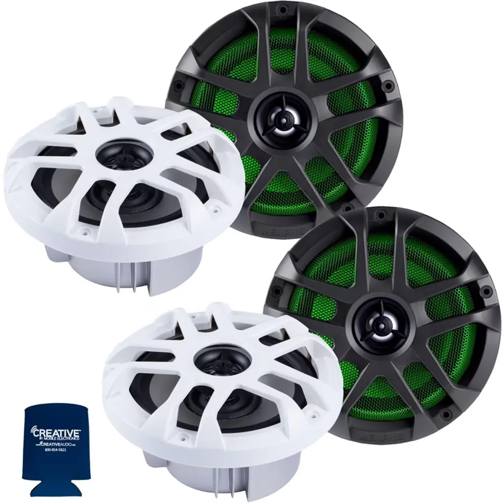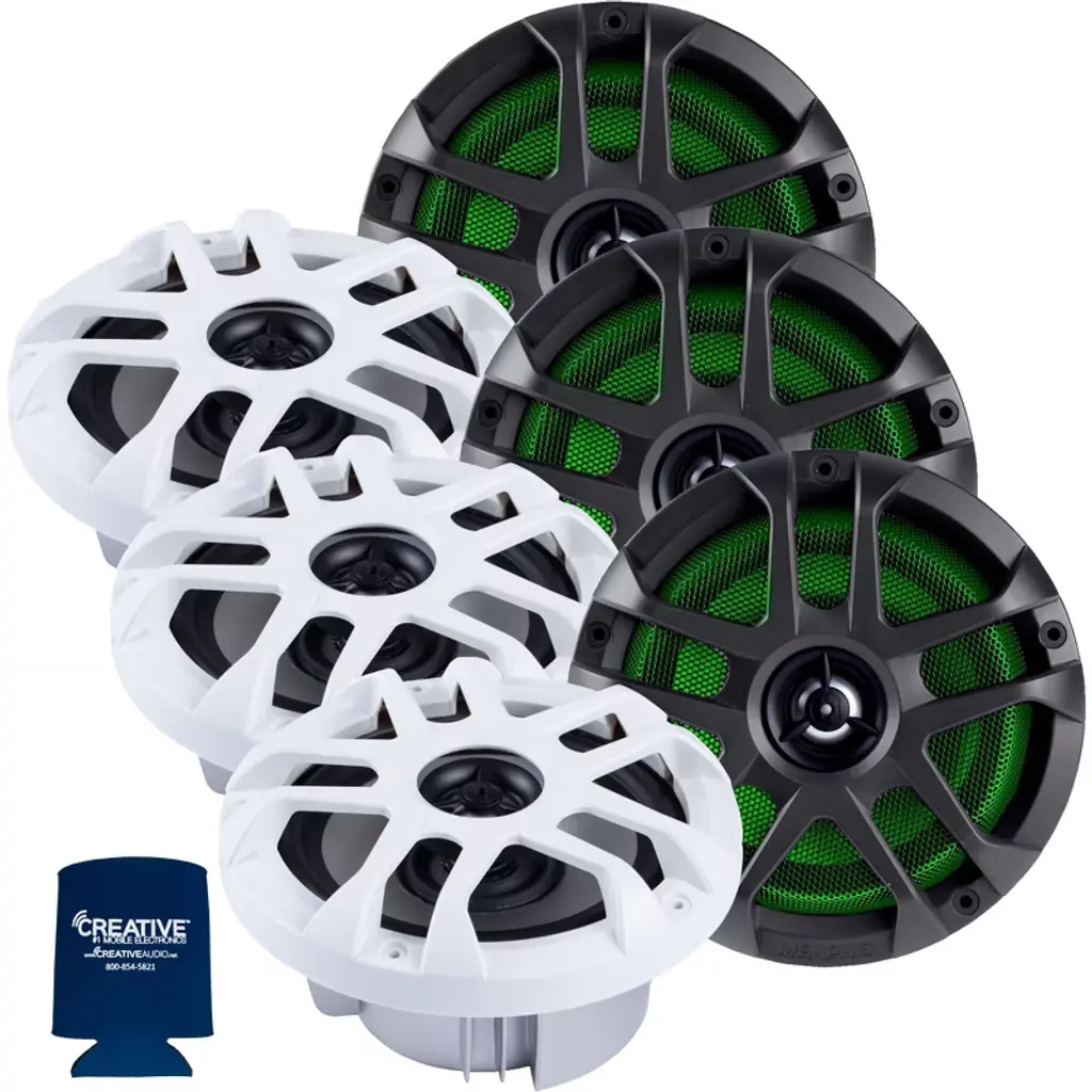 Memphis Audio LED Marine Speaker 6 Pack MXA80L 8" Marine Grade, Included Black and White Grills With RGB LED - 3 Pair - This bundle includes 3 pairs of the Memphis Audio MXA80L MXA 8" Marine Grade Coaxial Speakers with RGB LED - Pair, and a Creative Audio coozy. Memphis Xtreme Audio speakers are designed to perform in rugged conditions that demand extra element and water protection. Boats, Side-by-sides, trucks whatever your application, MXA speakers will continue to perform no matter what you throw at them. Bring the party anywhere the road takes you with MXA Audio. MXA80L speakers are water and element resistant and designed to perform in extreme environments. From boats, to powersports equipment to off-road vehicle, These 8" speakers provide amazing sound and deep bass even in open air environments. MXA gear is UV coated to withstand the harsh sunlight for long days on the lake or trails and are salt tested for corrosion for ocean applications. The MXA80L ships with protective grills in both gunmetal and white with removable protective mesh inserts. Each set of MXA80L speakers features integrated RGB LED technology to bring your equipment to life when the sun goes down. Features: • Both gunmetal and white grills ship standard with speakers • Grills designed to house optional LEDSP2 RGB LED rings • Swivel mount aluminum tweeter • Injection molded poly cone • Butyl rubber surround • High temp abs composite basket • UV coated for ultraviolet light protection • Water and element resistant • RGB LED Lighting included in grills Specifications: • Size (in) 8" • RMS Power (w) 60 • Peak Power 120 • Sensitivity (dB) 89 • Mounting Depth (in) 3.35 • Magnet Size (oz) 14 • Warranty 1 • Grill included Y (1 White, 1 Gunmetal)