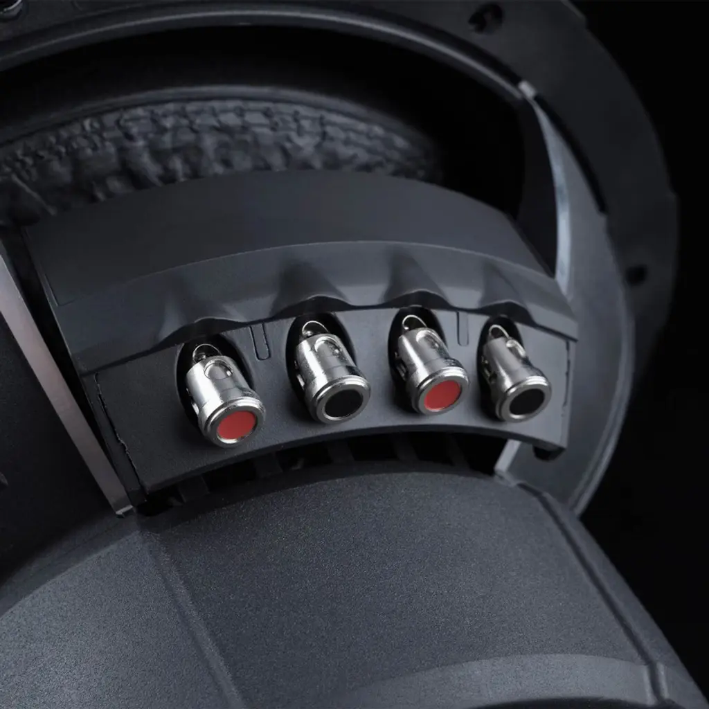 Taking a cue from the popular MOJO Pro speaker line, the MOJO Pro subwoofers are high output, no-nonsense SPL machines developed to fit in more traditional enclosures allowing MOJO bass to be brought to even more applications. MOJO Pro 12" 4Ω DVC subwoofers are built to handle 750w RMS power and will produce thunderous bass that will please anyone who loves it loud. Features: Specifically designed for high SPL performance DVVC Direct Vent Voice Coil Cooling 2.5” Voice Coil Cross drilled front plate venting Aluminum shorting ring for reduced inductance Double stitched foam surround Rigid paper cone Progressive spider Diecast basket Single Sided compression terminals Thiele Small Parameters: Resonant Frequency (fs): 36.7Hz Mechanical Q (Qms): 7.217 Electrical Q (Qes): 0.764 Total Q (Qts): 0.69 Sensitivity: 85.68 dB Xmax Linear: 0.51 in Displacement: 0.16 cf. Air Volume of Suspension (Vas): 1.09 cf. Moving Mass (Mms): 241.3g Suspension Compliance (Cms): 0.078 mmN Effective Piston area (Sd): 530.93 SqCm Motor Strength (Bl): 11.23 TM DC Resistance: 1.73 Ohms Voice Coil and Magnet: Impedance Series: 8 Ohms Impedance Parallel: 2 Ohms Voice Coil Diameter: 2.5 in RMS Power: 750 watts Peak Power: 1500 watts Magnet Weight: 120 oz. Magnet Diameter: 6.69 in. Physical Dimensions: Mounting Depth: 6.23 in Cutout Diameter: 11.34 in Frame Outside Diameter: 12.94 in Enclosure Recommendations: Single Sub Sealed: 1.5 cf. Dual Subs Sealed: 2.7 cf. Single Sub Vented: 2.5 cf. Port Dimensions: 5"x5"x27"L Tuning Frequency: 36 Hz Dual Sub Vented: 4.6 cf. Port Dimensions: 7" x 6" x 23"L Tuning Frequency: 36 Hz