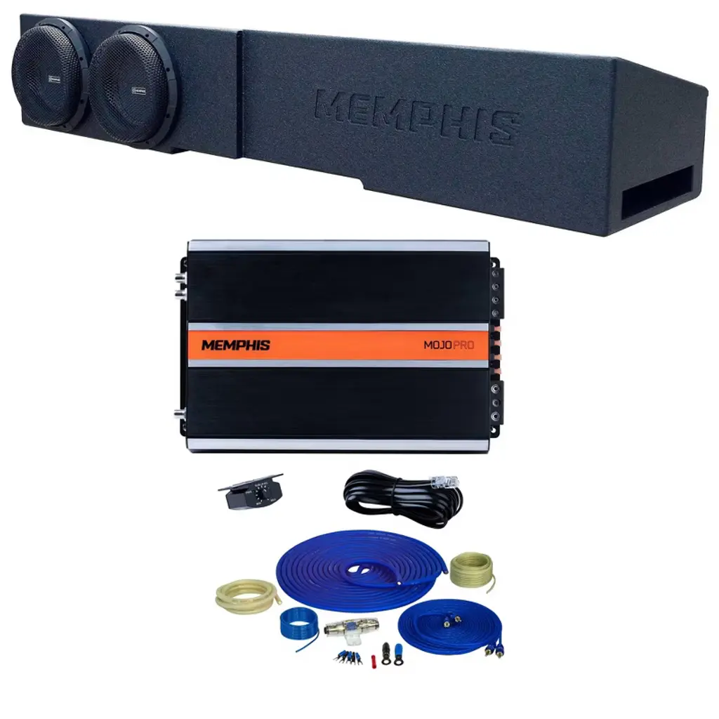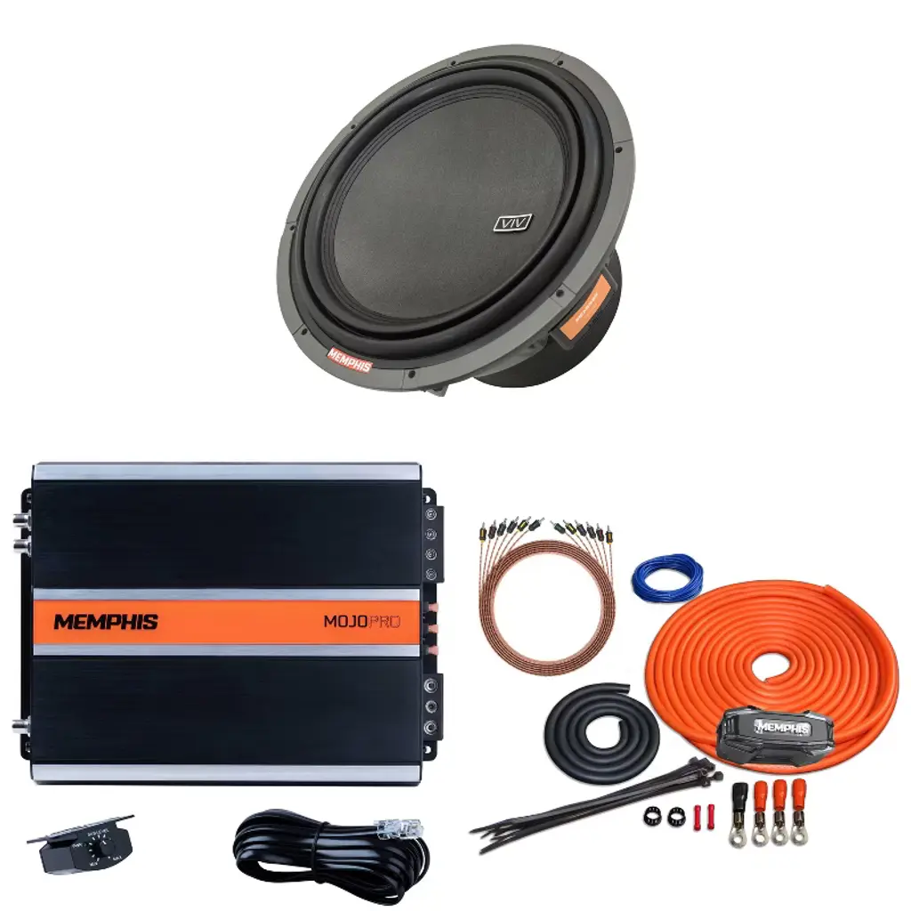 Experience unparalleled sound quality with this comprehensive bundle featuring top-of-the-line Memphis Audio products. Included is the Memphis Audio 0GKIT 0-Gauge Amp Install Kit with ANL Fuse Holder, a Pair of ETP-17 17-Foot RCAs, the Memphis Audio MJP1500.1 Monoblock Subwoofer Amplifier, and the Memphis MJPE12D1 Dual 12" MJP 1-Ohm Loaded Subwoofer Enclosure. The 0-Gauge Amp Install Kit ensures maximum performance with 100% pure copper wire and power distribution blocks, while the Monoblock Subwoofer Amplifier boasts 1500 Watts RMS x 1 at 1-Ohm, variable EQ bass boost, and extruded aluminum heatsink. Paired with the Dual 12" Loaded Subwoofer Enclosure tuned to 34 Hz for deep, powerful bass, and featuring custom-stitched carpet and high-temp BASV voice coil former, this bundle transforms any vehicle into an extraordinary sound system. Enjoy the ultimate audio experience with Memphis Audio's premium components. Dimensions: 7.5 x 2 x 11 inches (Amplifier); L 34.65 x H 15.15 x D 12.6 inches x Bottom D 17.72 inches (Subwoofer Enclosure).