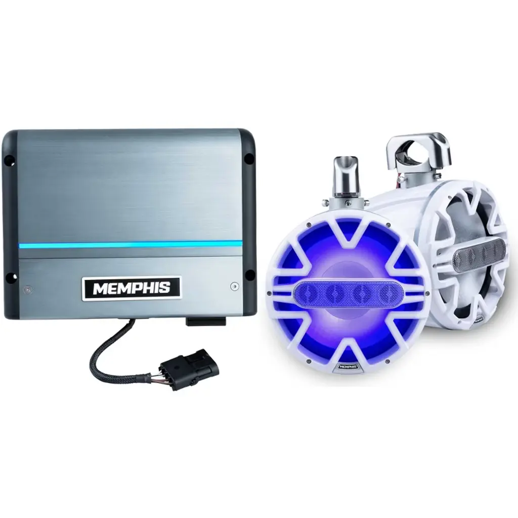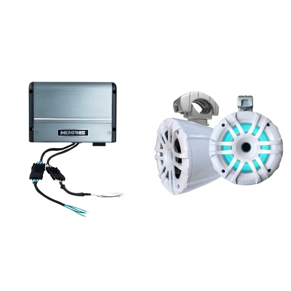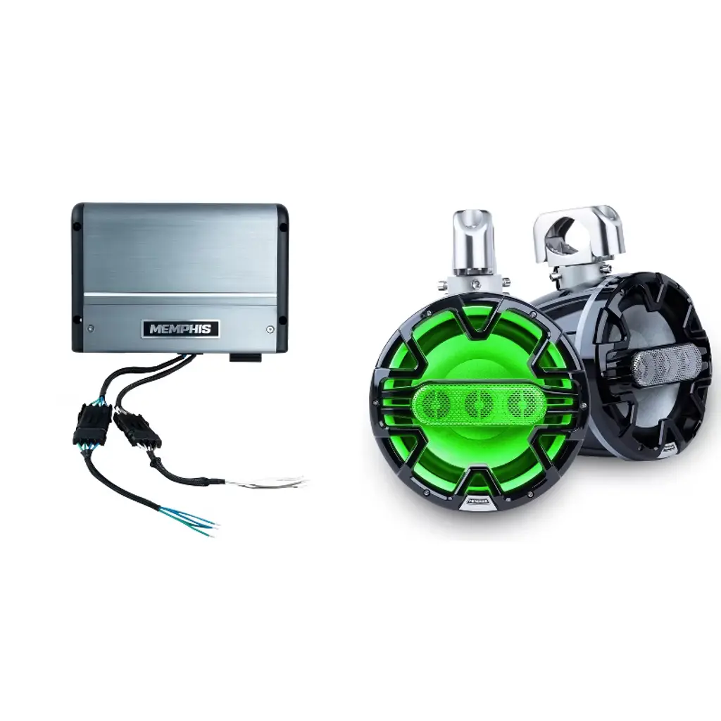 This bundle includes a Memphis Audio MM600.2V 2-Channel Marine Amplifier and a pair of Memphis Audio 84TB 8" Tower Speakers. The MM600.2V marine amplifier boasts IPX5 rating, extruded aluminum heat sink, and 12dB/octave butterwort crossovers. It features sealed connectors, variable bass boost, and protection circuitry against overload and short circuits. The 8" tower speakers, equipped with Advanced Tower Array Construction (ATAC™) and RGB lighting, deliver unrivaled sound quality and clarity. They feature a stainless steel array grille, swivel brackets, and an ASA plastic enclosure. With 200W RMS and 400W peak power, these speakers have a sleek Shadow Black finish, IP66 rating, and fit 1.75-3" bars. This impressive bundle offers marine-grade durability, premium sound output, and versatile installation options, making it an ideal choice for enhancing your marine audio experience.