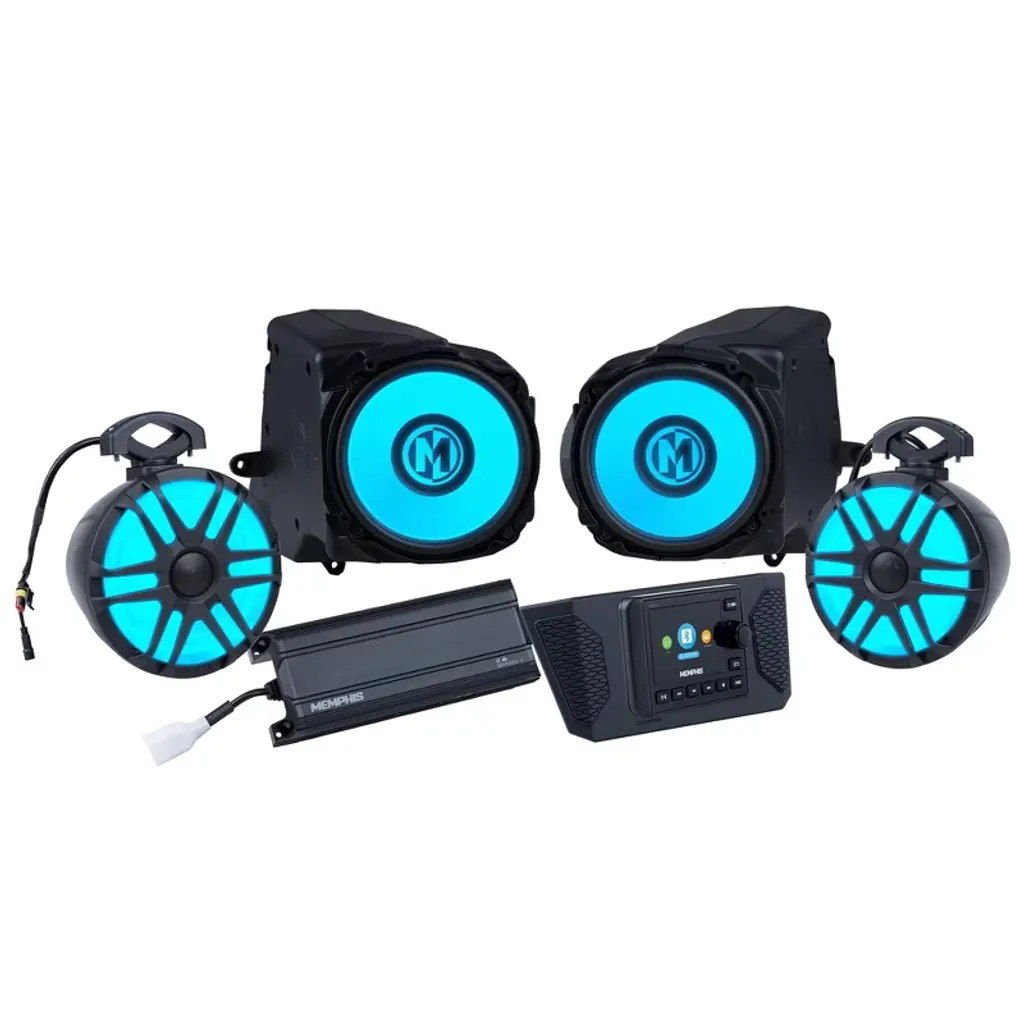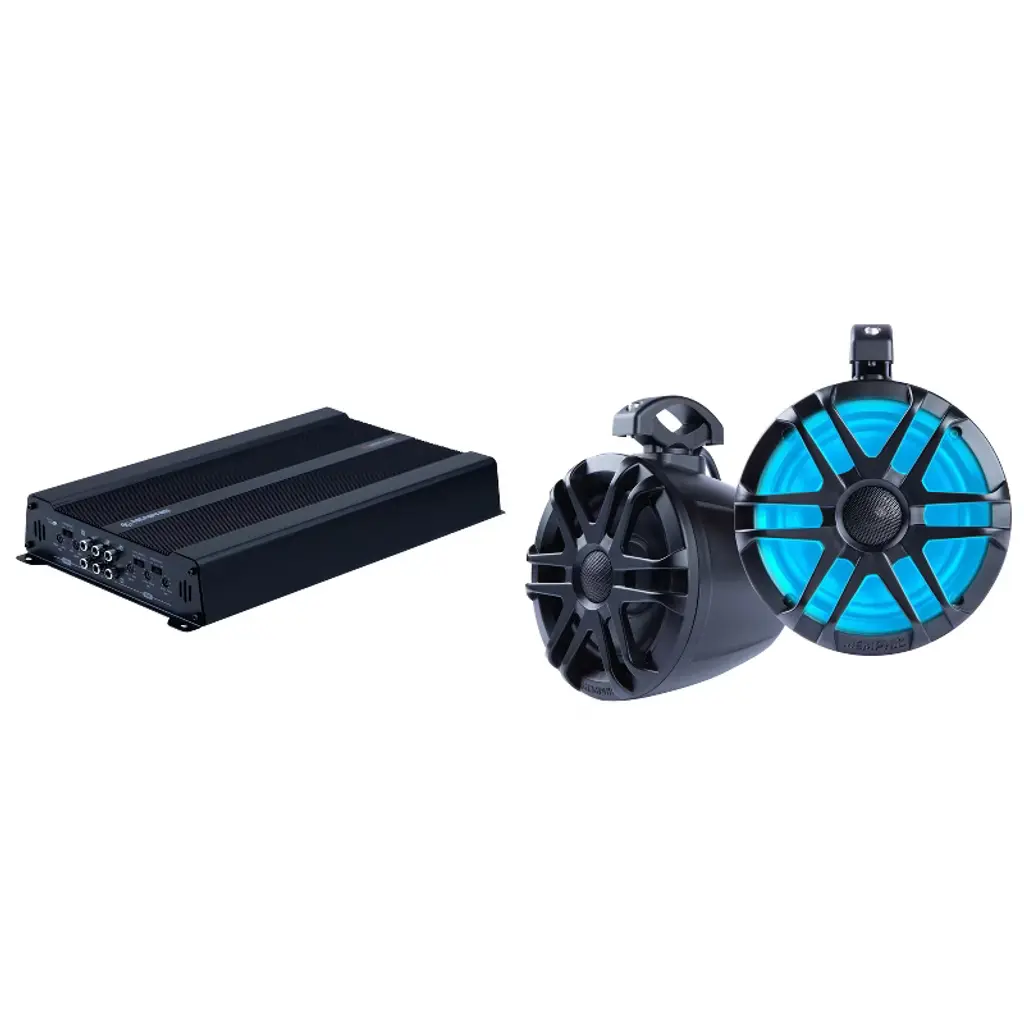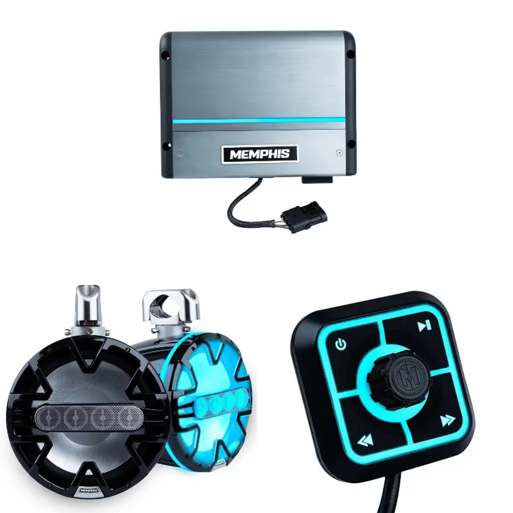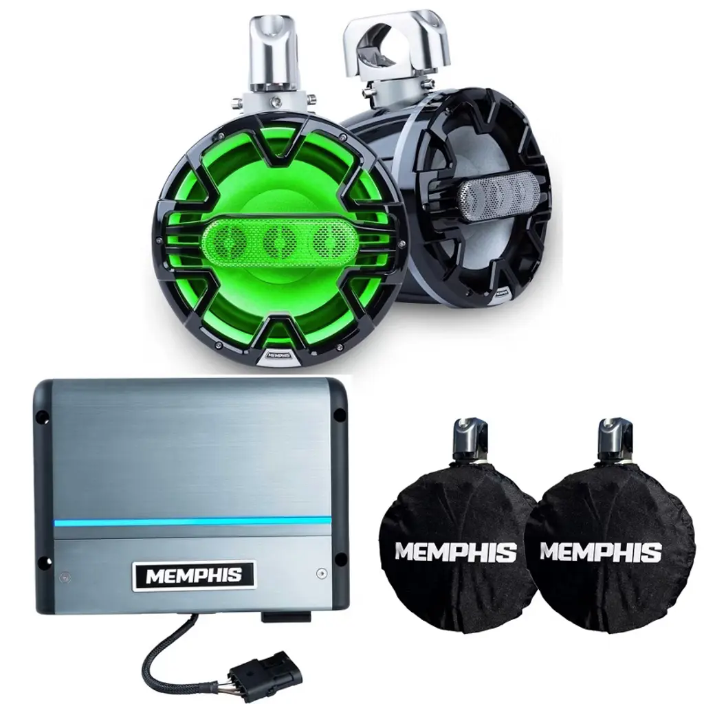 This bundle includes a Memphis Audio MM600.2V 2-Channel Marine Amplifier and a pair of Memphis Audio 84TB 8" Tower Speakers. The MM600.2V marine amplifier boasts IPX5 rating, extruded aluminum heat sink, and 12dB/octave butterwort crossovers. It features sealed connectors, variable bass boost, and protection circuitry against overload and short circuits. The 8" tower speakers, equipped with Advanced Tower Array Construction (ATAC™) and RGB lighting, deliver unrivaled sound quality and clarity. They feature a stainless steel array grille, swivel brackets, and an ASA plastic enclosure. With 200W RMS and 400W peak power, these speakers have a sleek Shadow Black finish, IP66 rating, and fit 1.75-3" bars. This impressive bundle offers marine-grade durability, premium sound output, and versatile installation options, making it an ideal choice for enhancing your marine audio experience.