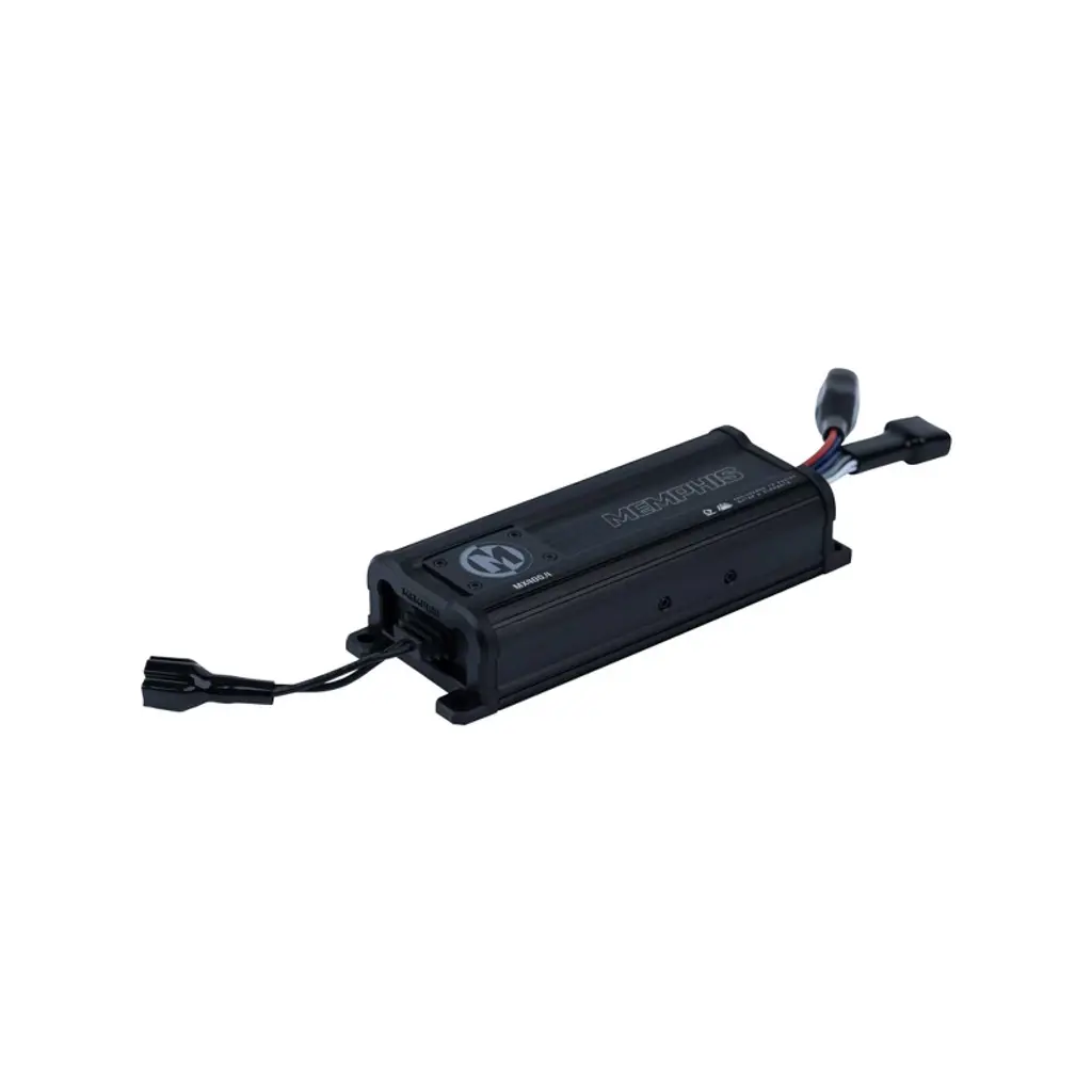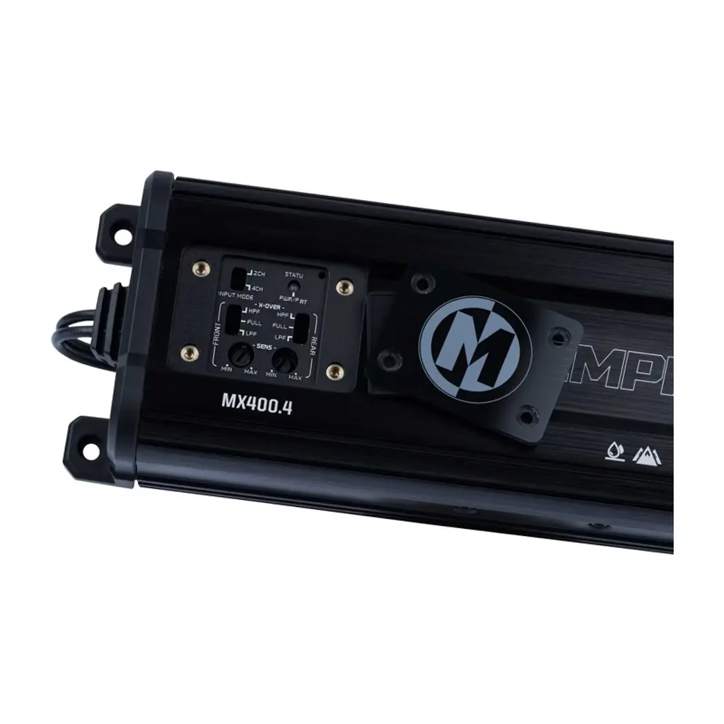 Memphis MX powersports amplifiers were designed with powersports at their core. These IP66 rated compact amplifiers provide massive power in a small package making them the perfect fit for most limited space side by side audio systems. The conformal coated boards and water resistant plugs make sure these amplifiers will continue to crank out big power in the any weather. A top mounted water resistant cover protects the easy access top mounted controllers making tuning simple even in tight spaces. Features: Compact design Conformal coated board IP66 rated water & element resistant Top mounted controls MX400.4 fixed Crossover 80Hz Sealed connectors High/low input 2/4 Input Switch (MX800.4 MX400.4) Specifications: RMS POWER 4Ω: 75 x 4 RMS POWER 2Ω: 100 x 4 BRIDGED/MONO POWER 4Ω: 200 x 2 THD% 4Ω: <1% FREQ RESPONSE: 10Hz – 20kHz DIMENSIONS L x W x H: 8.75 x 3.25 x 1.75 INPUT RANGE: 300mV – 9.7V AMP KIT: 8GKIT