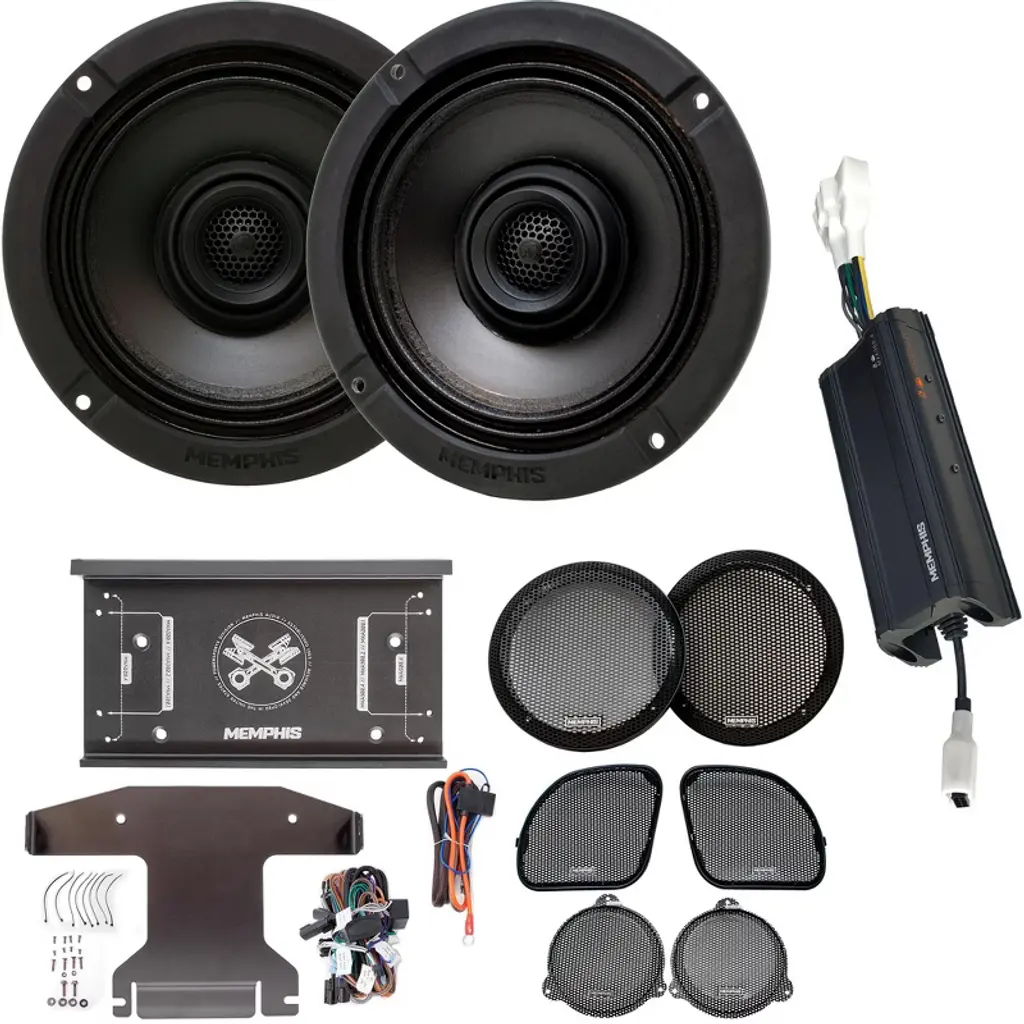 Memphis Audio MXAHDPRO4 4 6.5 Inch Speaker Motorcycle Audio Compatible With Harley Davidson Direct OEM Kits - This bundle is for 2014 and up Harley Davidson Street Glides and 2015 and up Road Glides. It includes 2 Memphis Audio MXA62HD 6.5" Direct Fit Upgrade Speakers Compatible With Harley Davidson 2014+ Street Glide and 2015+ Road Glide, a Memphis Audio Harley Davidson OEM Direct Fit Amplifier Installation Kit for 2014+ Harley Davison Street Glide and 2015+ Road Glide, and a Memphis Audio MXA300.4 Powersports 4-Channel Amplifier 75x4. Memphis Audio MXA62HD 6.5" Direct Fit Upgrade Speakers Compatible With Harley Davidson 2014+ Street Glide and 2015+ Road Glide Features: Specifications: • SIZE - 6.5" • RMS - 75w • PEAK - 150w • SENSITIVITY - 93dB • MAGNET TYPE - Neodymium • MOUNTING DEPTH - 2.3" Memphis Audio MXA300.4 Powersports 4-Channel Amplifier 75x4 Specifications: • RMS POWER 4Ω (w) 65 x 4 • RMS POWER 2Ω (w) 75 x 4 • Bridged/Mono Power 4Ω (w) 150 x 2 • THD% 4Ω <1% • Frequency Response 20Hz - 20kHz • Dimensions L x W x H 8.625 x 3.25 x 1.75 • Warranty (years) 2 Years • Input Range 300mV-9V • Recommended Amp Kit • 10GKIT Memphis Audio Harley Davidson OEM Direct Fit Amplifier Installation Kit for 2014+ Harley Davison Street Glide and 2015+ Road Glide Kit includes: 2 Amplifier mounting adapter plates to fit either Road Glide or Street Glide Plug & Play wire harnesses designed to flatten factory EQ into amplifier Features: Designed for 2014+ Harley-Davidson Street Glide/Road Glide and Tour-Pak IP66 weather proof design Low profile proprietary film dome tweeter with neodymium magnet Tweeter features integrated Wave guide for improved low mid-range output Carbon-Fiber Reinforced Polypropylene Cone Santoprene Surround Santoprene Front Spider for weather resistance High Power 35mm Voice-Coil
