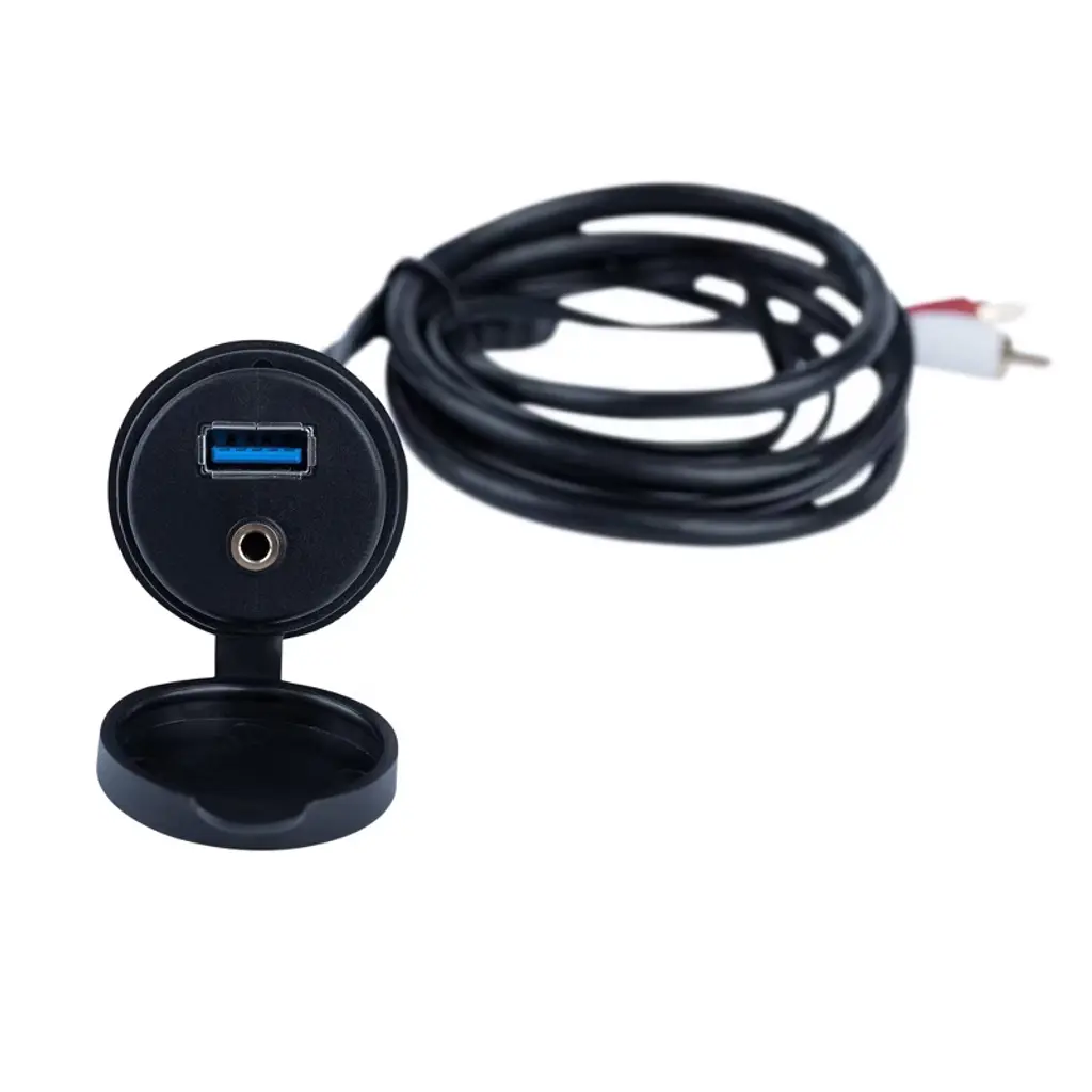 The MXUSBA is a versatile 1.25″ round AUX and USB connection device, enabling seamless connections between your audio system and various devices using 3.5mm AUX cords and USB connections. Designed with covered marine-grade ports, it’s an ideal choice for marine and powersports applications. This unit effortlessly fits into a 1″ hole, offering easy and flexible mounting options. With 3 feet of included wire, you’ll have ample room to connect it to your radio or other devices, ensuring a hassle-free setup for your audio needs. FEATURES • Designed for Marine & Powersports applications • 3.5MM Input, Male RCA output • 1″ Mounting Diameter • 1.25″ Overall diameter • Includes 3Ft of wire to connect other devices • Sealed Cover • IPX6 Rated SPECIFICATIONS Inputs: Wire Gauge: 3.5MM, USB; Quantity: 2 Outputs: Wire Gauge: Male RCA; Quantity: 4