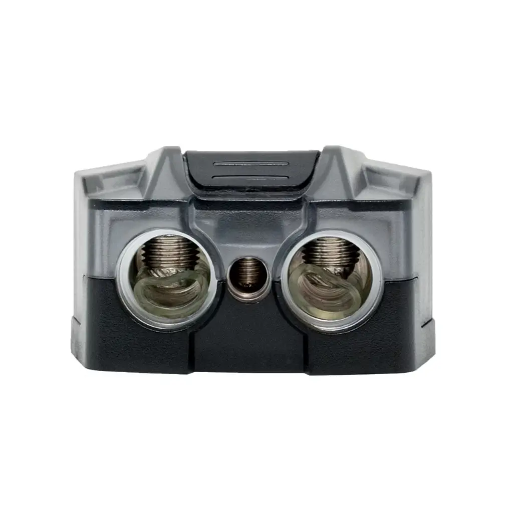 Negative or positive battery terminal with two 0AWG and 1 8AWG outputs. Nickel plated brass for better current transfer NPBAT fits BOTH positive & negative terminals Matte translucent black cover Adjustable aluminum logo badge 2 0AWG and 1 8 AWG outputs DESCRIPTION: + / - Battery Terminal DISTRIBUTION: 1 - 0/4 AWG INPUT/OUTPUT: 1- 0/4 AWG