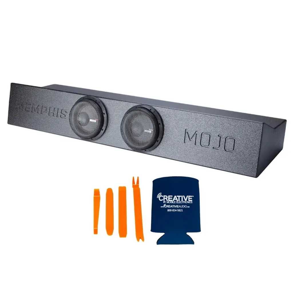 Memphis MJMEFORD8D1 Ported enclosure with two 8" MOJO subwoofers compatible with select 2009-up Ford trucks with PRXA1500.1 Power Reference Series Mono Subwoofer Amplifier and Amp Wiring Kit - This bundle includes: Memphis Audio MJMEFORD8D1 Ported enclosure with two 8" MOJO Mini subwoofers — fits select 2009-up Ford trucks, Memphis Audio PRXA1500.1 Power Reference Series Mono Subwoofer Amplifier, 1500 Watts RMS x 1 at 1-Ohm, Stinger 1/0GA 1500W COMPLETE WIRING KIT, a pry kit, and a Creative Audio coozy. Memphis Audio MJMEFORD8D1 Ported enclosure with two 8" MOJO Mini subwoofers — fits select 2009-up Ford trucks Features: • Loaded side-ported enclosure with two MOJO MINI 8" subwoofers • Fits 2009-up Ford F150 Super Crew and 2017-up F250/F350 Super Duty trucks • Installs under the rear seat • Designed to fit without modification to interior • Power handling: 1800 watts RMS (3600 watts peak) Memphis Audio PRXA1500.1 Power Reference Series Mono Subwoofer Amplifier, 1500 Watts RMS x 1 at 1-Ohm Specifications: • RMS POWER 4Ω 700x1 • RMS POWER 2Ω (w) 1000x1 • RMS POWER 1Ω (w) 1500x1 • THD% 4Ω <1% • Frequency Response 20Hz - 20kHz • Dimensions L x W x H (in) 16.1 x 7.5 x 2.1 • Warranty (years) 1 • Input Range 220mV - 6V • Recommended Amp Kit 0GKIT Stinger 1/0GA 1500W COMPLETE WIRING KIT Featuring Ultra Flexible CCA cable construction for excellent current transfer to power hungry amplifiers on a budget. Quality twisted pair interconnects for noise free signal transfer. Also includes , remote turn-on ANL high current fuse holder and ring terminals for a complete installation package. Includes: 17FT Matte Blue Ultra Flexible Power Wire (CCA) 3FT Matte Gray Ultra Flexible Ground Wire (CCA) 17FT Twisted Pair RCA Interconnects (OFC) 17FT Blue Remote Turn-on Wire (CCA) 1pc. High Current ANL Fuseholder with 150A fuse