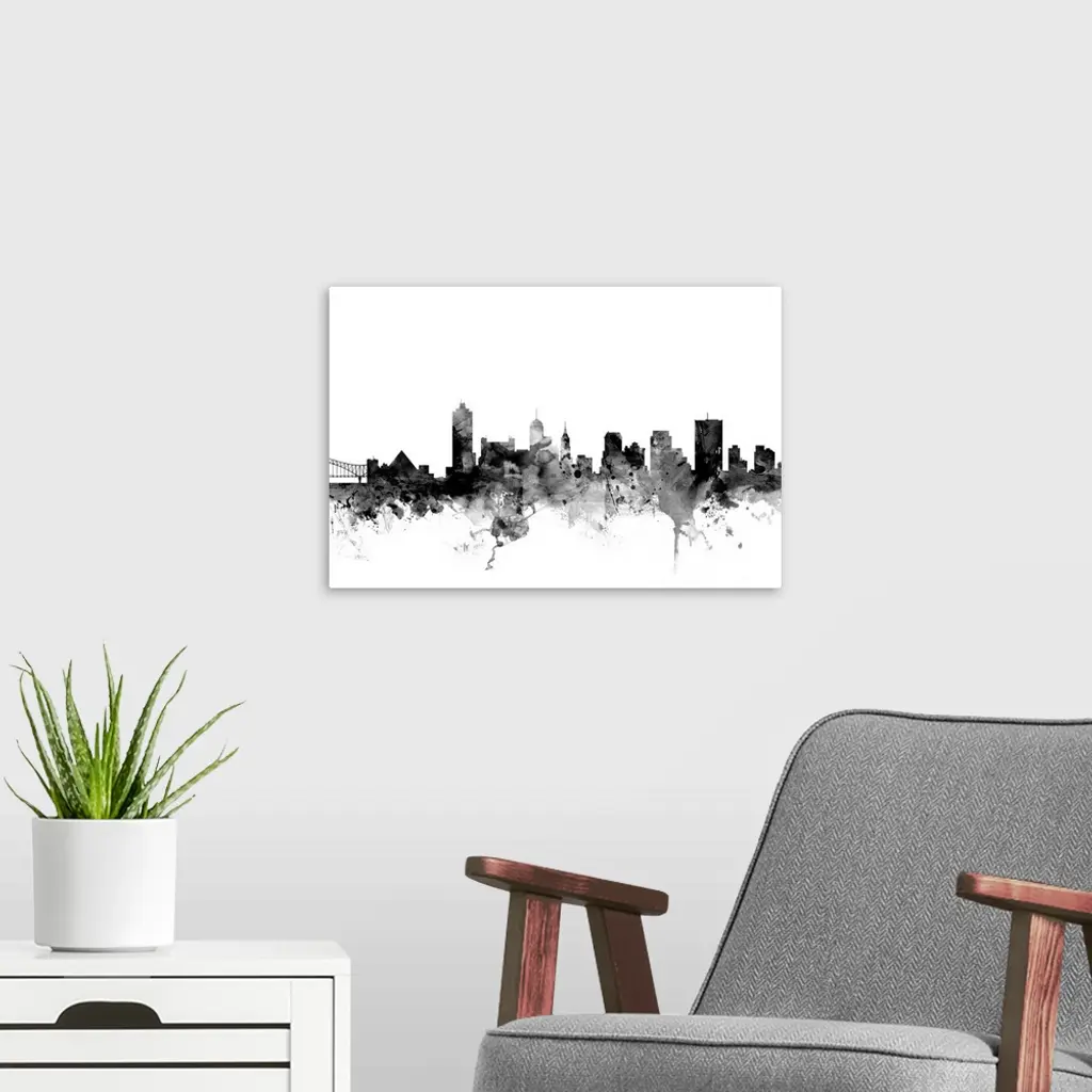 Smokey dark watercolor silhouette of the Memphis city skyline.