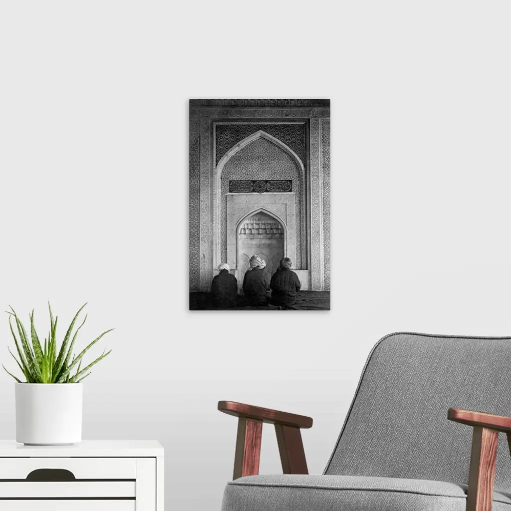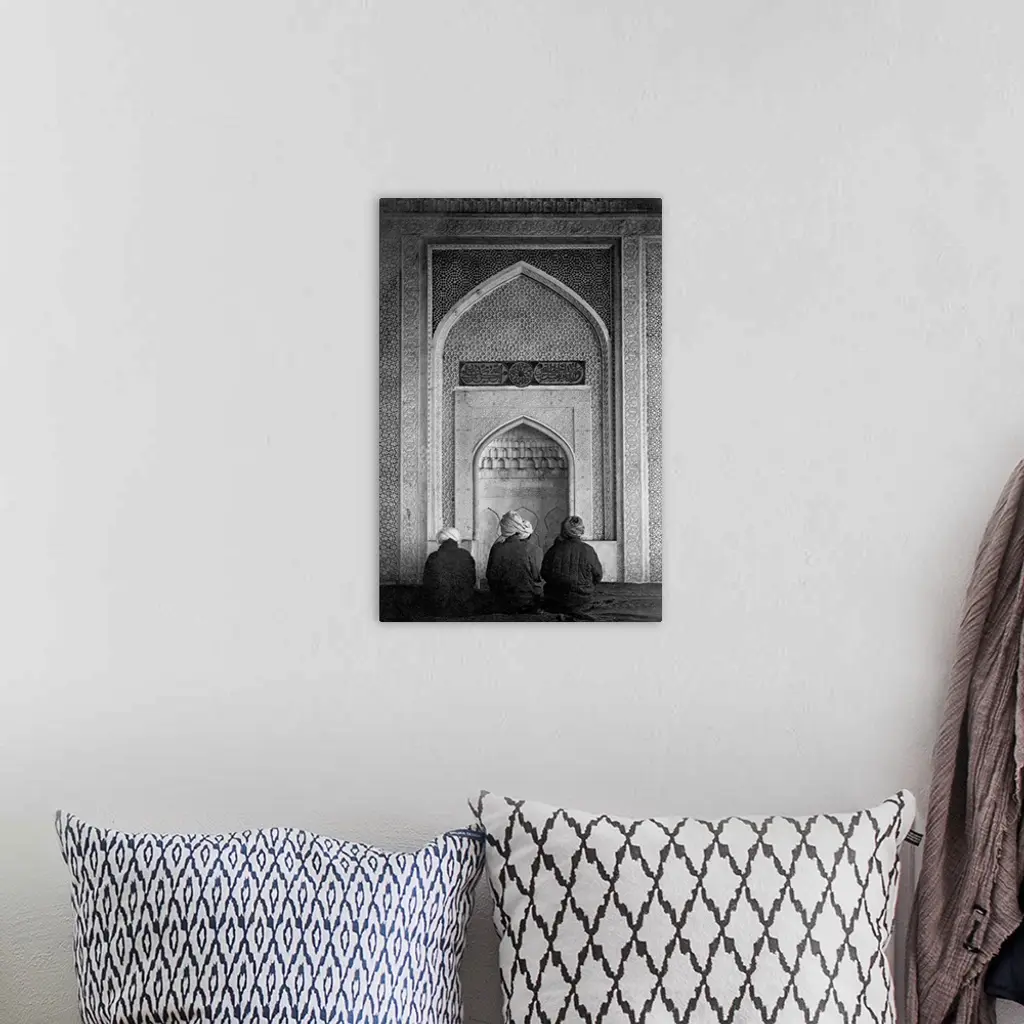 Four Muslims pray at the qibla niche, a recessed part of a mosque wall which shows the direction of Mecca, at the Kok Gumbez Mosque. The mosque, in the town of Uroteppa (also called Istaravshan), is also known as the Abulatif Sultan Mosque.