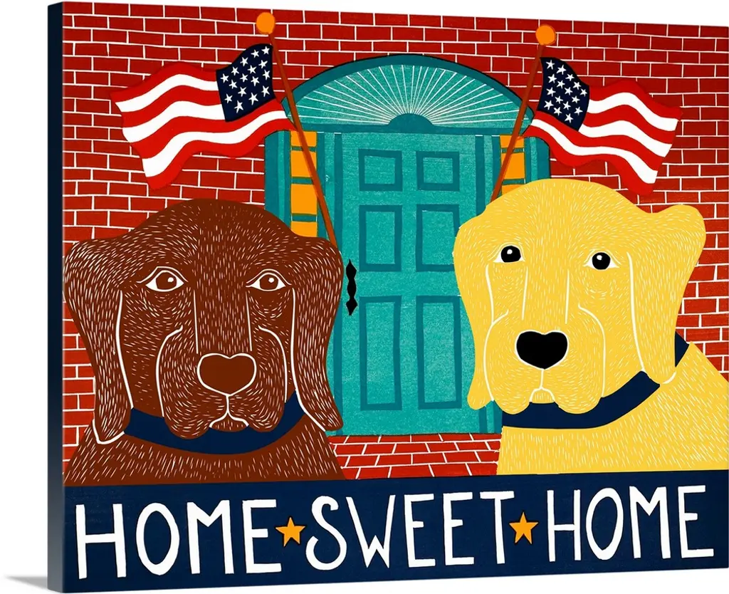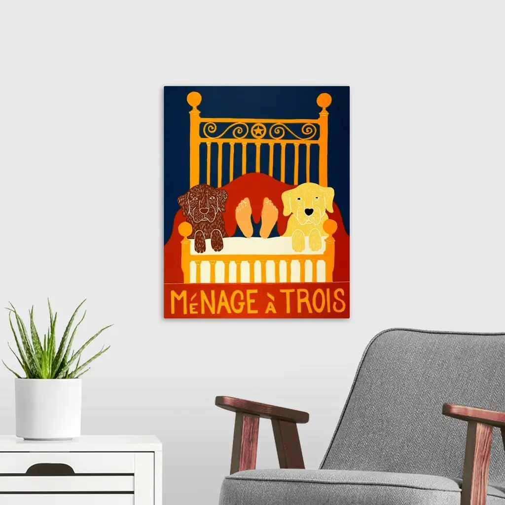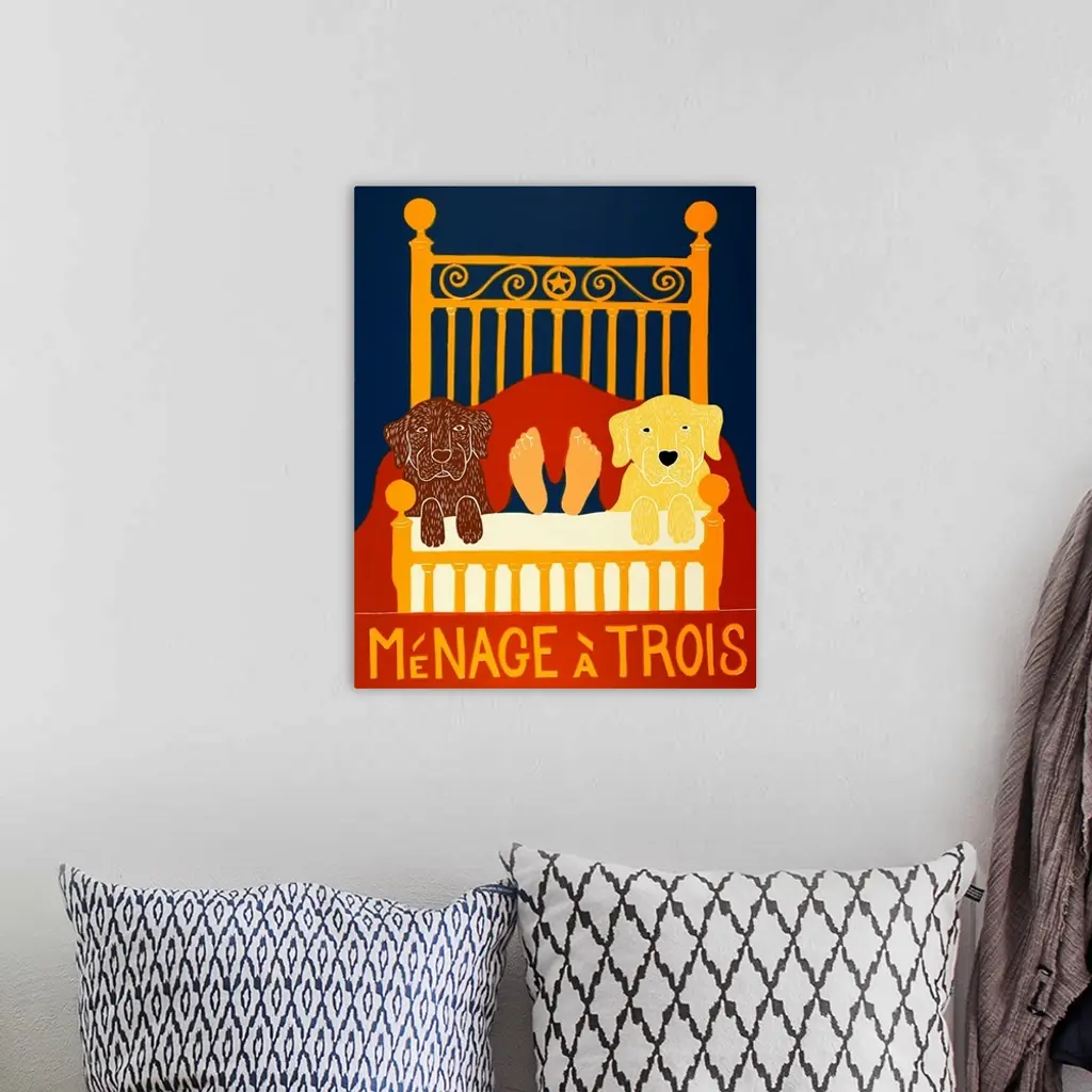 Illustration of a yellow and chocolate lab laying next to their owners legs at the foot of the bed with the phrase "Menage a Trois" written on the bottom.