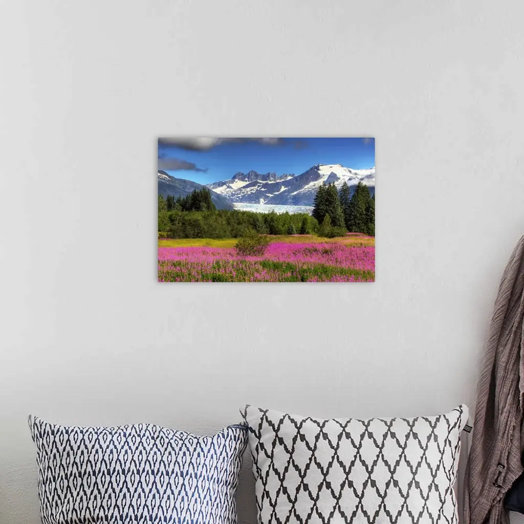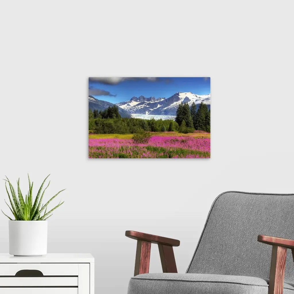View Of The Mendenhall Glacier With A Field Of Fireweed In The Foreground, Southeast, Alaska Summer, Hdr Image
