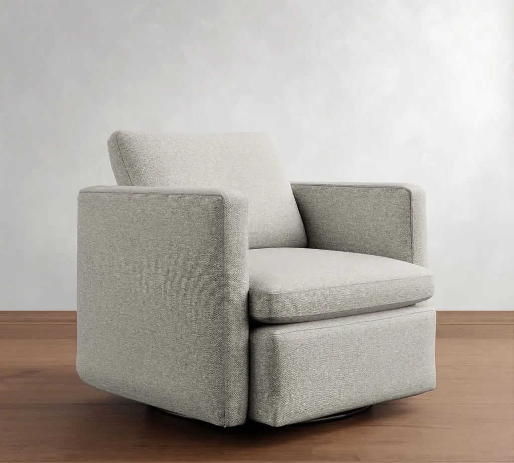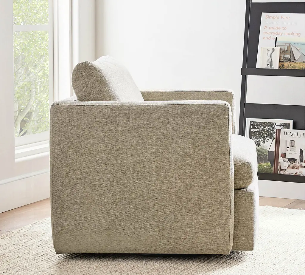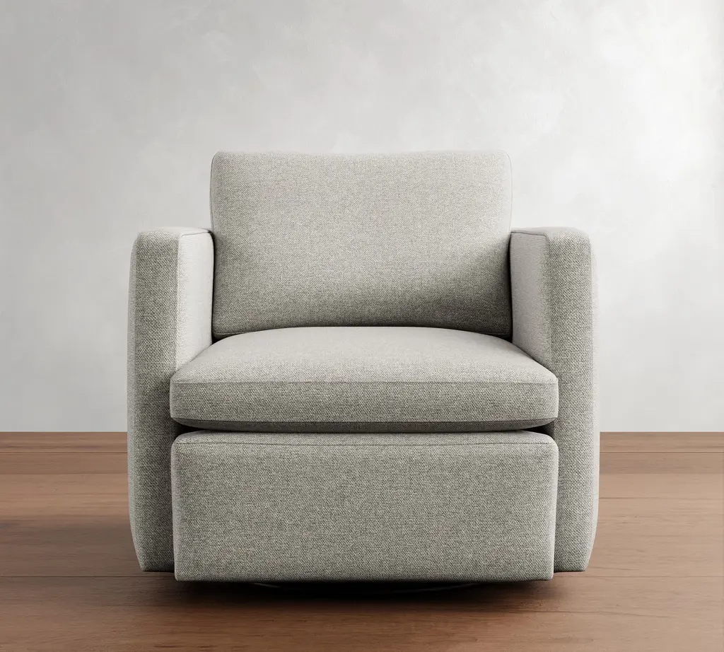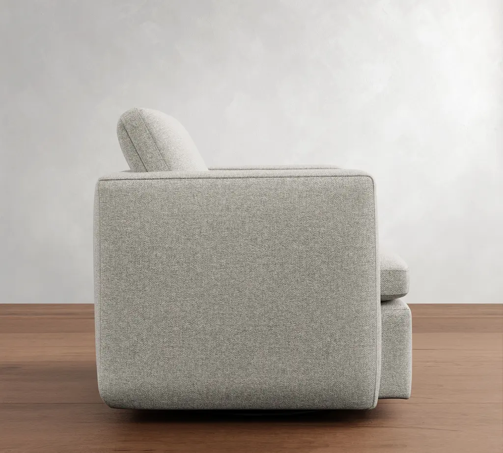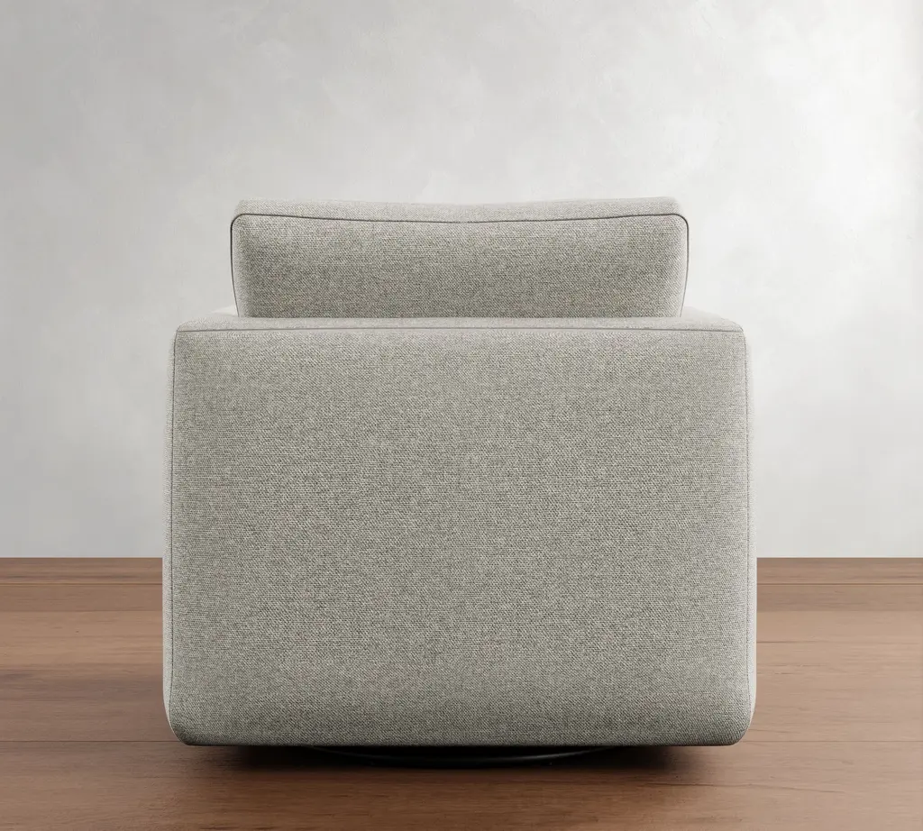Our chair’s clean, simple form recalls the geometric look of 20th-century modernism. Set upon a swivel base, the enveloping, shelter-style frame wraps the silhouette in a continuous line, while slender track arms create a crisp counterpoint to a comfortably padded seat cushion. Menlo’s compact size makes it versatile enough for your living area or bedroom.