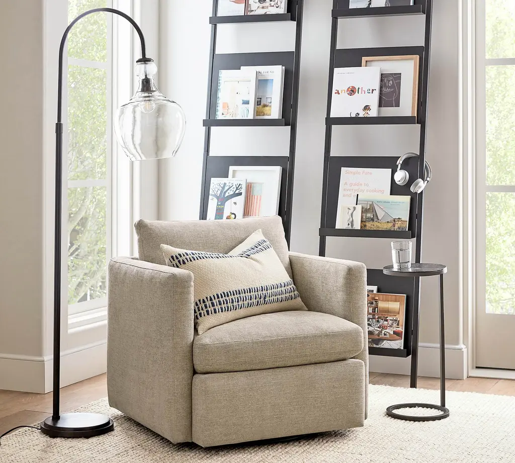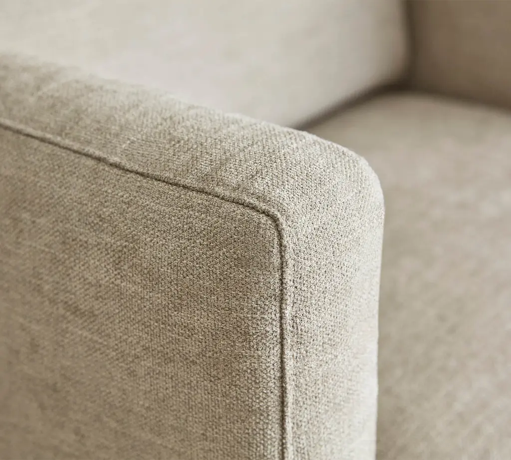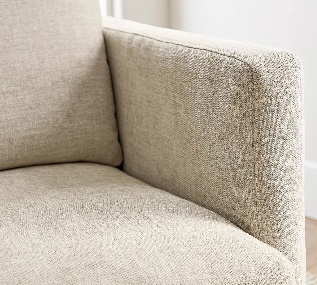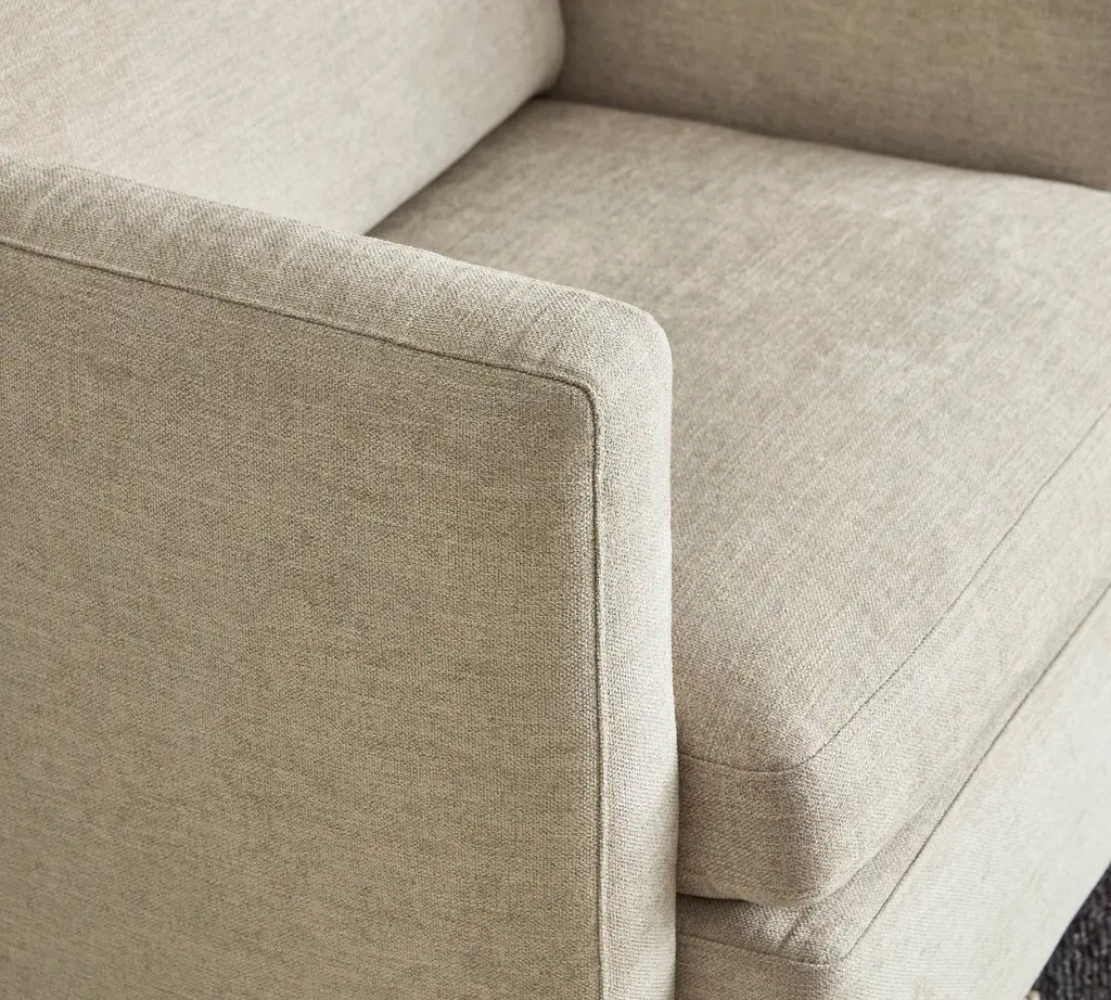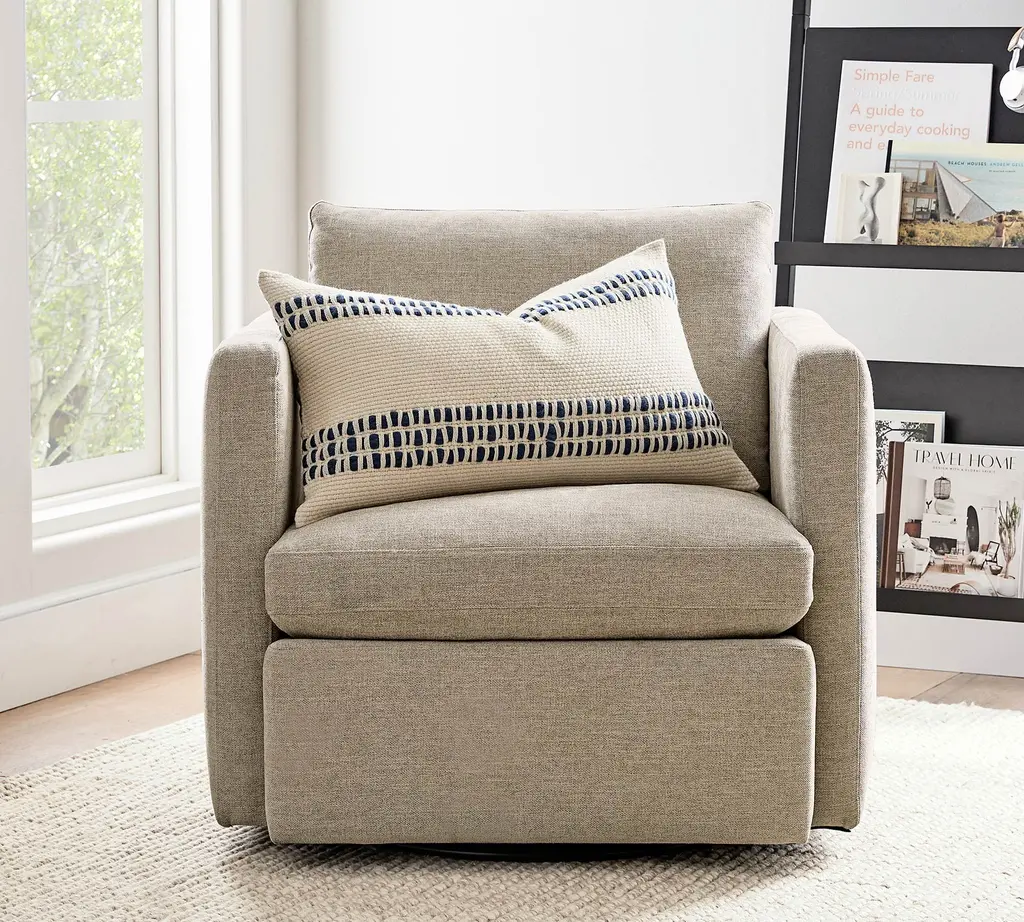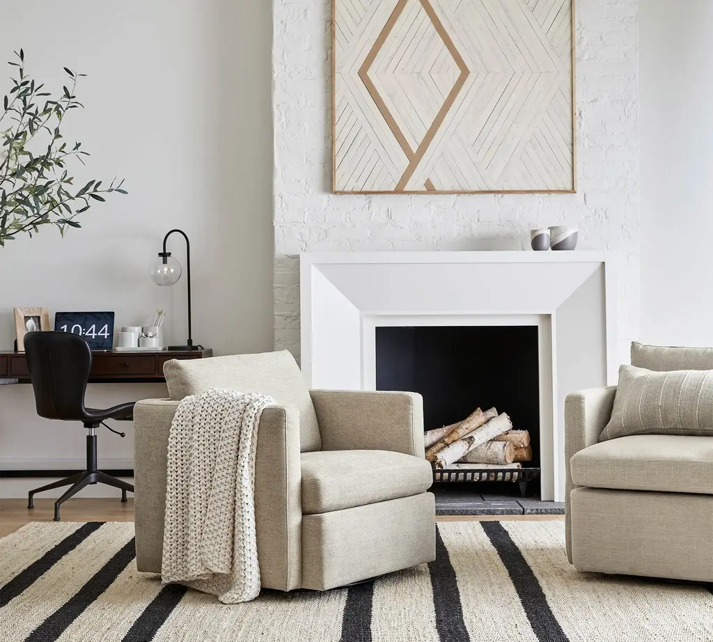 Our chair’s clean, simple form recalls the geometric look of 20th-century modernism. Set upon a swivel base, the enveloping, shelter-style frame wraps the silhouette in a continuous line, while slender track arms create a crisp counterpoint to a comfortably padded seat cushion. Menlo’s compact size makes it versatile enough for your living area or bedroom.
