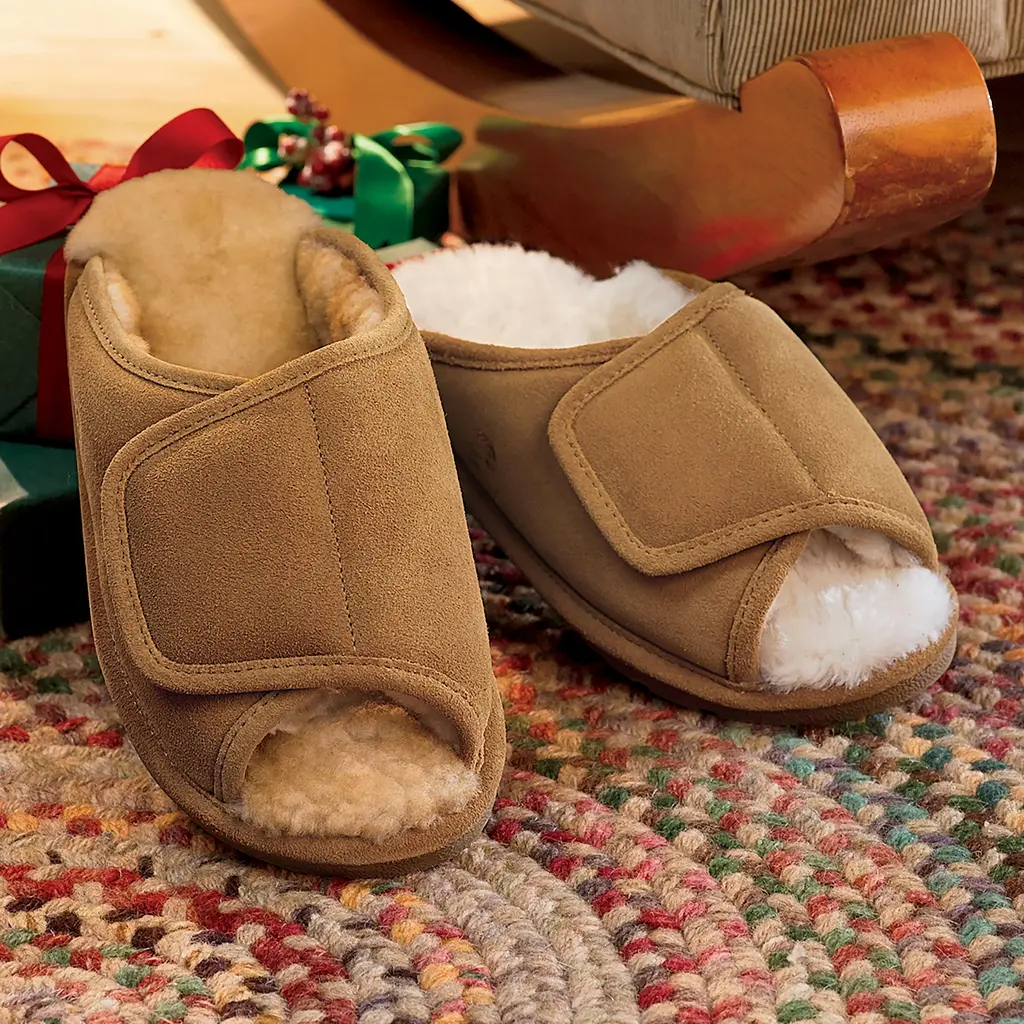 Australian sheepskin makes these Side-Wrap Slippers the perfect loungewear for winter or summer. A large, Velcro strap folds over your foot for the perfect fit. Hard soles for indoor or outdoor use. Half sizes order up. Imported.