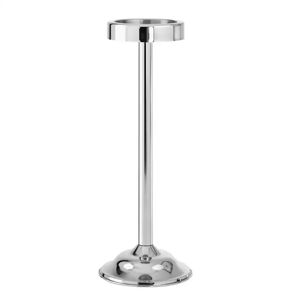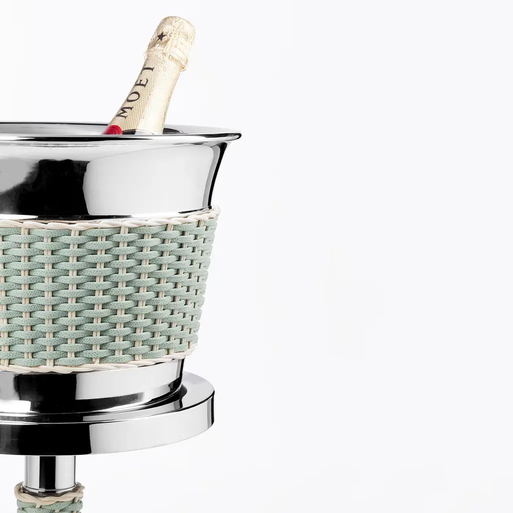 Part of a superlative and luxurious series of champagne buckets and bottle coolers, this champagne bucket with stand will add a lavish and sophisticated accent to a dining room. The perfect harmony between modern flair and traditional craftsmanship, it is entirely fashioned of stainless steel and partially upholstered in a hand-woven natural rattan and green Napa leather cover. Ideally paired with the Menton Champagne Buckets, it can also hold any other model with a maximum lower diameter of 20cm.