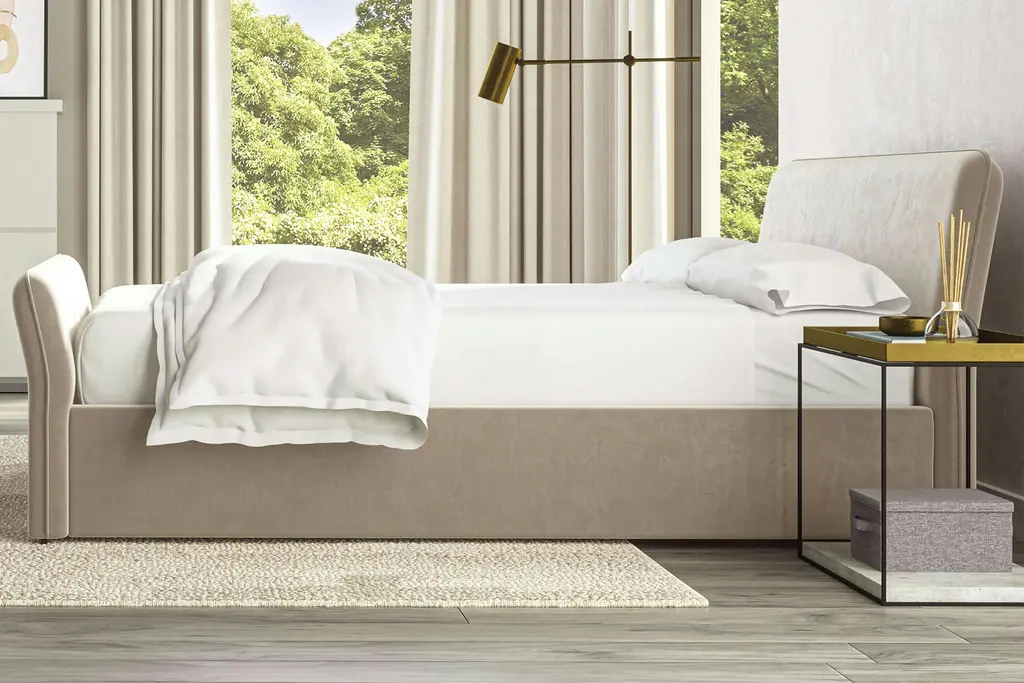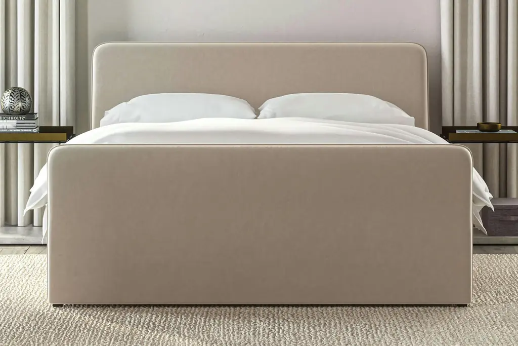 Inspired by the charming and cozy Italian town where it takes its name, the Merano bed frame reimagines the sleigh bed silhouette with its gently angled headboard and footboard. No foundation or box spring required.