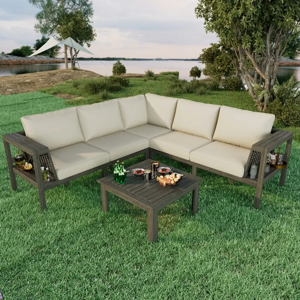 Transform your outdoor living space into a stylish and functional relaxation area with this 4-Piece Outdoor Acacia Wood Sofa Set. This L-shaped sofa set includes a right armchair, left armchair, corner piece, and a matching coffee table. Crafted from durable acacia wood, this set is perfect for relaxing with family and friends. The sofa set features soft, high-density cushions with washable covers for easy maintenance. The woven mesh armrests provide both aesthetic appeal and extra storage space, making this sofa set a perfect blend of style and functionality for your outdoor space.Specifications:Overall Product: 85.8''W x 85.8''D x 25.2''HTable Size: 27.6''W x 27.6''D x 14''HArm Sofa: 58.7''W x 27.2''D x 25.2''HCorner Sofa: 27.2''W x 27.2''D x 25.2''HSofa Weight Capacity: 396 LBS/SeatTable Weight Capacity: 176 LBSMaterial: Acacia Wood + Polyester + FoamPackage Quantity: 4(may not arrive at the same timeElevate your outdoor space with this 4-piece Acacia wood sofa set. Its stylish design, comfortable cushions, and functional storage make it a must-have for any modern patio or garden. With durable materials and thoughtful details, this set is sure to be the highlight of your outdoor relaxation area.