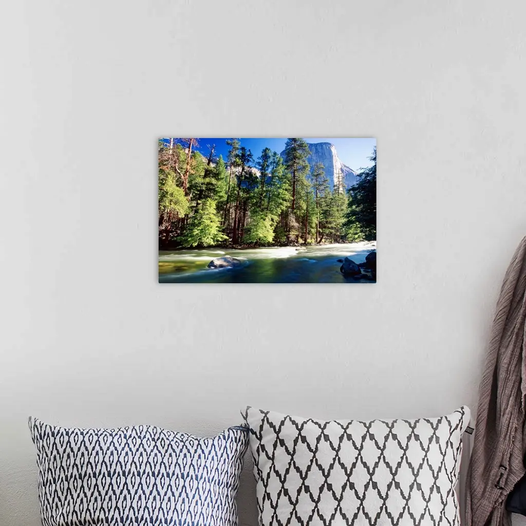 Low Angle View of river lined by forest with the El Capitan in the distance at the Yosemite National Park in California.