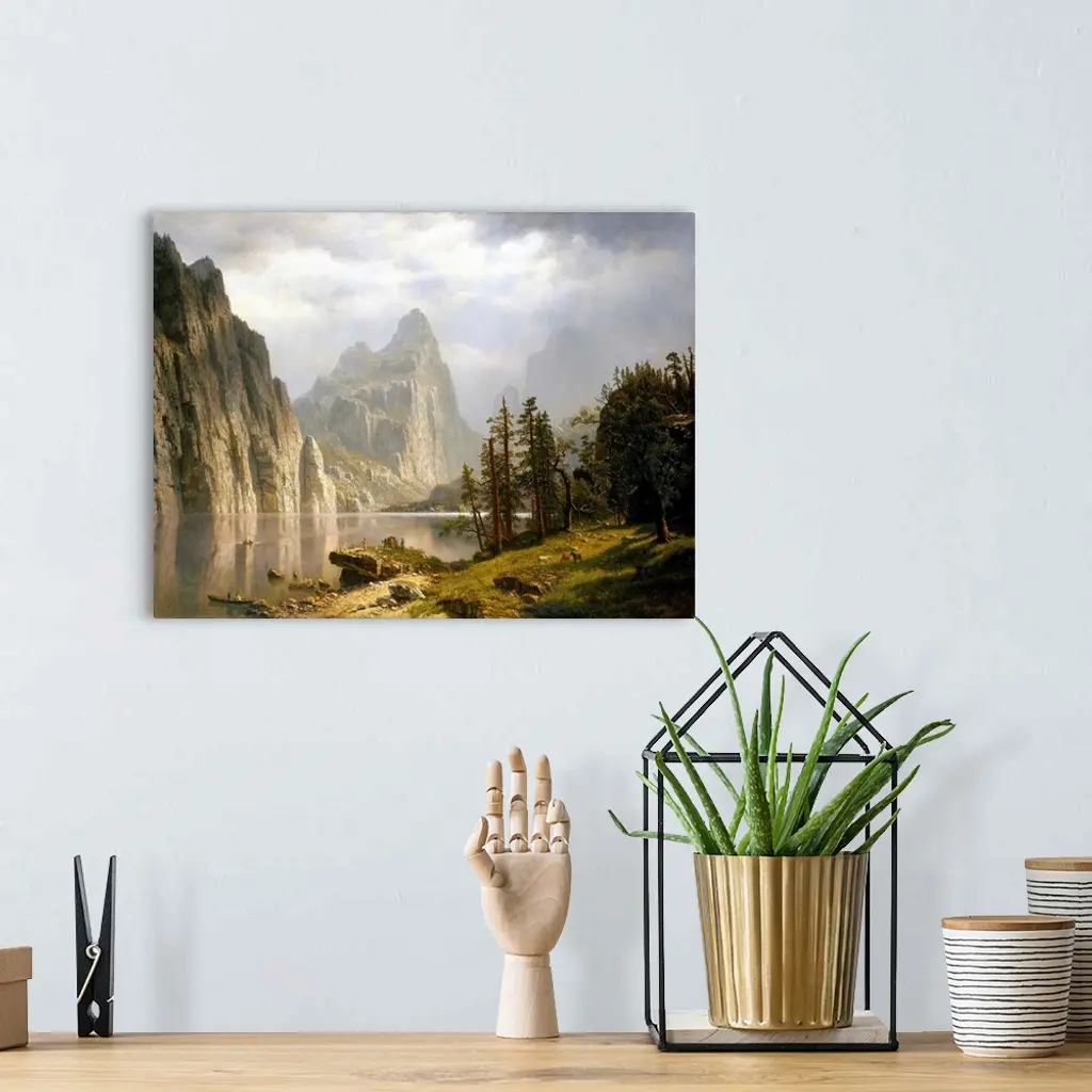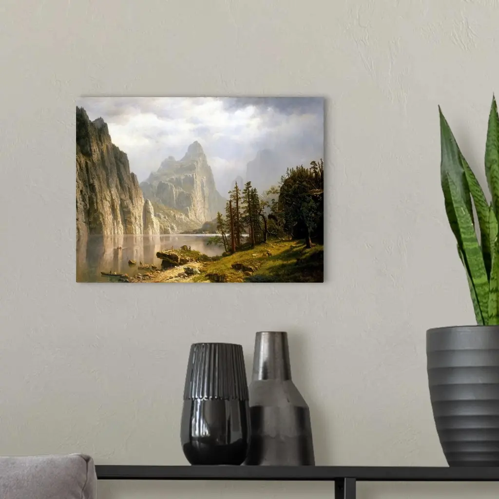 On May 12, 1863, in the company of the journalist and explorer Fitz Hugh Ludlow, Bierstadt departed on his second trip to the West. The two men camped in California's Yosemite Valley in August, probably inspired in their choice of destination by the stereoscopic photographs of Carleton E. Watkins, who had recorded the valley's magnificent scenery under various atmospheric conditions. From the many studies Bierstadt made during the trip, he painted several large works back in New York. In this canvas, as in many by him, monumental, jagged peaks dwarf the figures seen in the flat, carefully detailed foreground