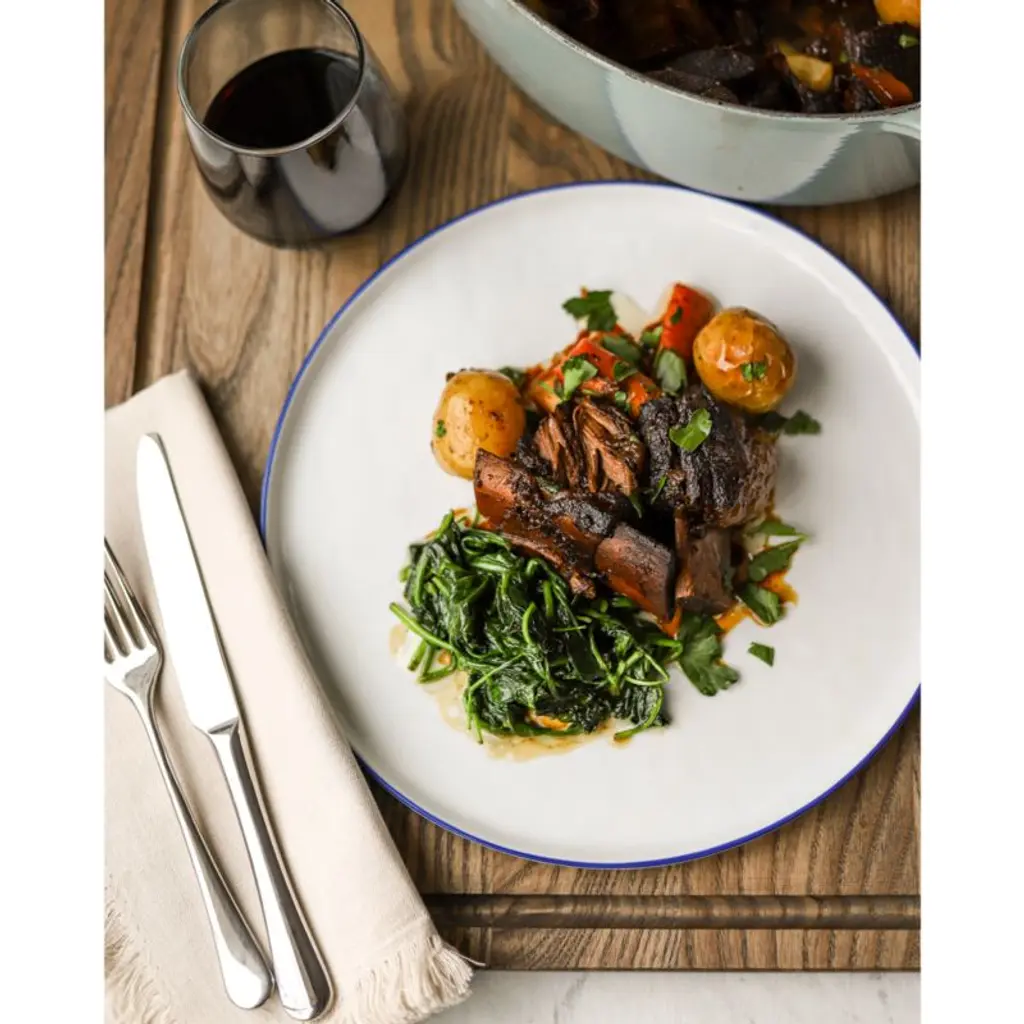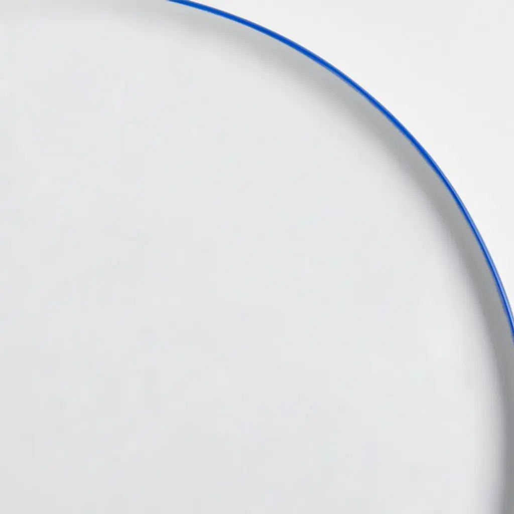 Outlined in blue, our contemporary Mercer porcelain whiteware represents a fusion of refinement and rusticity. The coupe shape of this set of eight dinner plates takes on organic overtones with freeform rims and finely "hammered" surfaces that ripple the light. Offering crisp contrast to the snow-white glaze, the blue rims bring a classic bistro vibe to low-key meals and smart dinner parties. Smooth enough to not harm table surfaces, the unglazed ceramic bottoms give each piece an artisanal look.