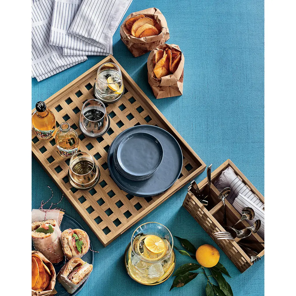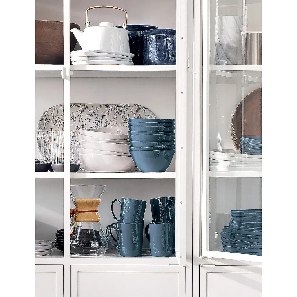 Striking a contemporary look with organic overtones, our set of eight Mercer round appetizer plates features slim silhouettes with freeform rims and a finely "hammered" surface that ripples the beautiful blue denim glaze. Smooth enough to not harm tables, the unglazed ceramic bottom gives each piece an artisanal look.
