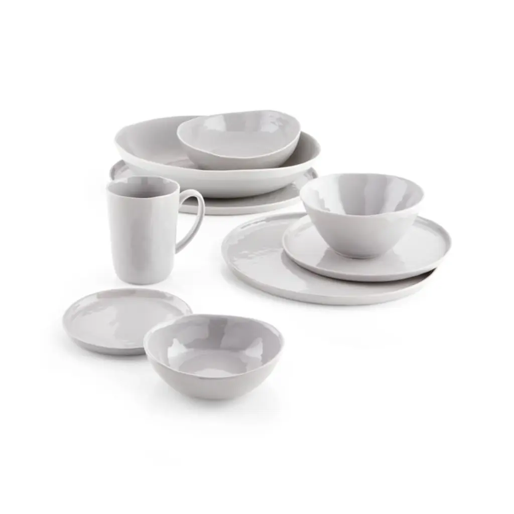 Our contemporary porcelain dinnerware sets a table of refinement and rusticity. Low-profile round appetizer plate takes on organic overtones with a freeform rim and a finely "hammered" surface that ripples the light. Made of grey-glazed natural clay, the plate may vary slightly in color. Smooth enough to not harm tables, the unglazed ceramic bottom gives each piece an artisanal look.