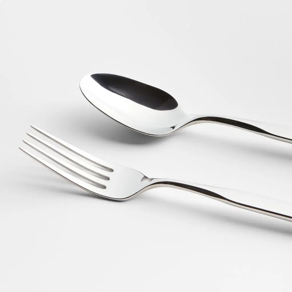 With its bright mirror finish, this highly polished flatware balances architectural angles with warmth and glamour. Elegant enough for dinner parties yet sturdy enough for everyday use, our exclusive Mercer flatware collection cleans up easily in the dishwasher after holiday feasts and weeknight meals. Each of the four five-piece place settings includes a salad fork, dinner fork, dinner knife, dinner spoon and teaspoon.