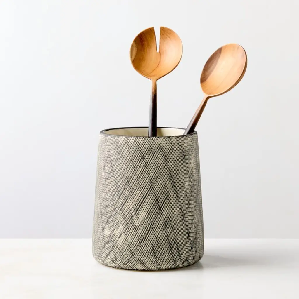 Contemporary porcelain whiteware represents a fusion of refinement and rusticity. Our white utensil holder takes on organic overtones with a freeform rim and finely "hammered" surface that ripples the light. Smooth enough to not harm shelves or countertops, the unglazed bottom surface gives each piece an artisanal look. The utensil holder corrals spoons, spatulas and turners next to the stove and coordinates with our exclusive Mercer dinnerware collection.