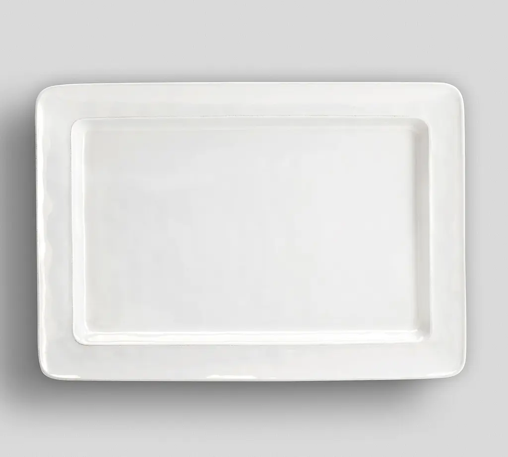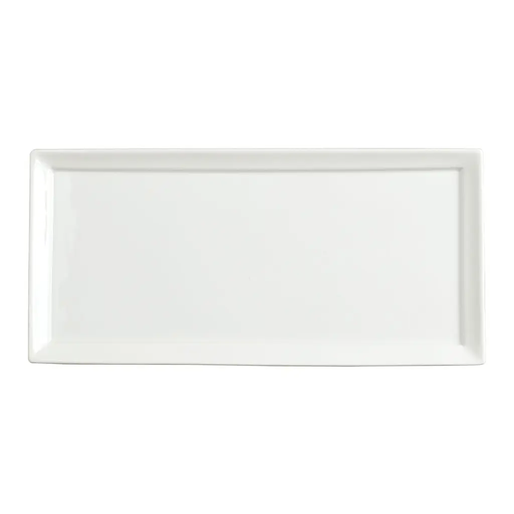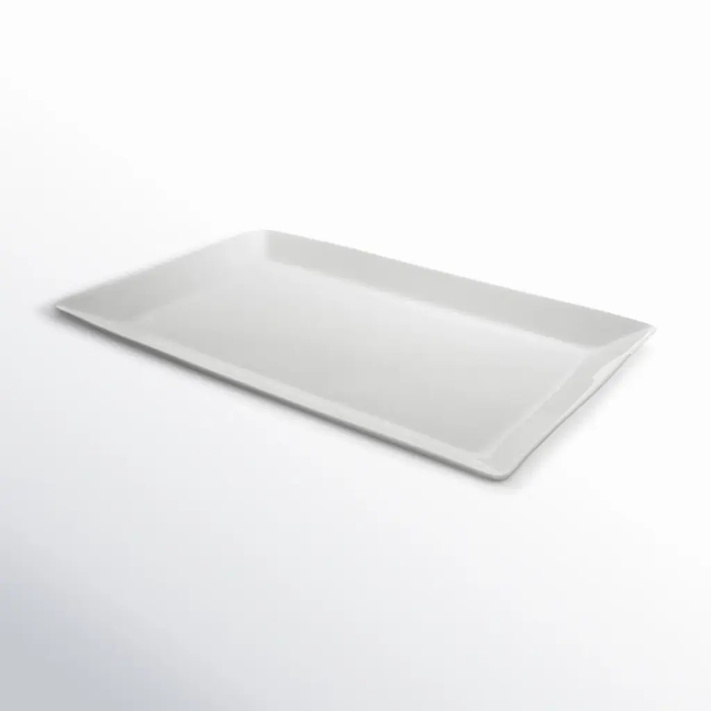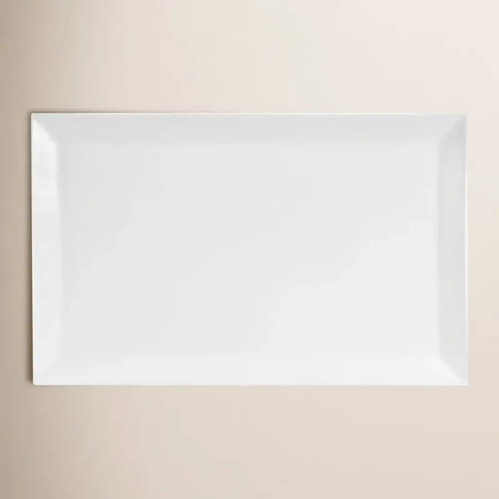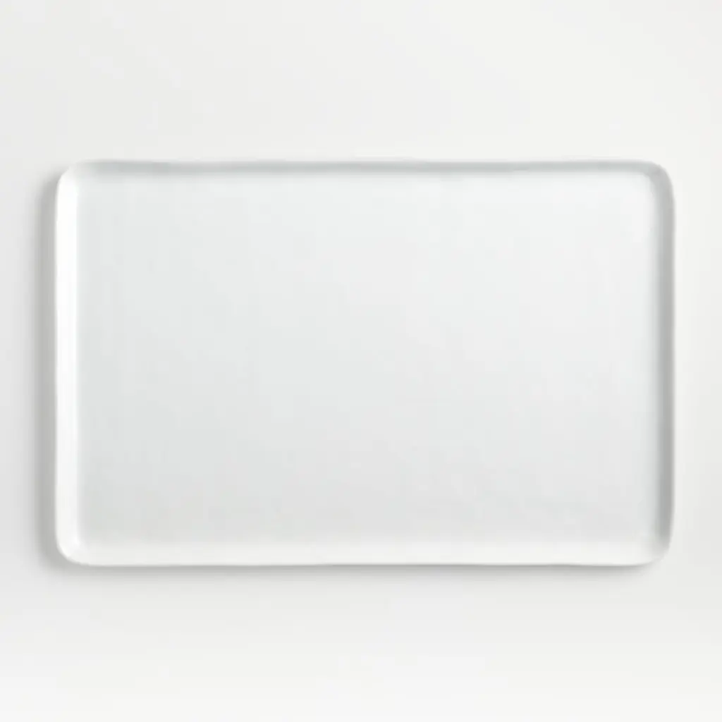 Contemporary porcelain whiteware represents a fusion of refinement and rusticity. The slim profile of this rectangular platter takes on organic overtones with freeform rims and a finely "hammered" surface that ripples the light. Smooth enough to not harm tables, the unglazed ceramic bottom surface gives each serving plate an artisanal look.