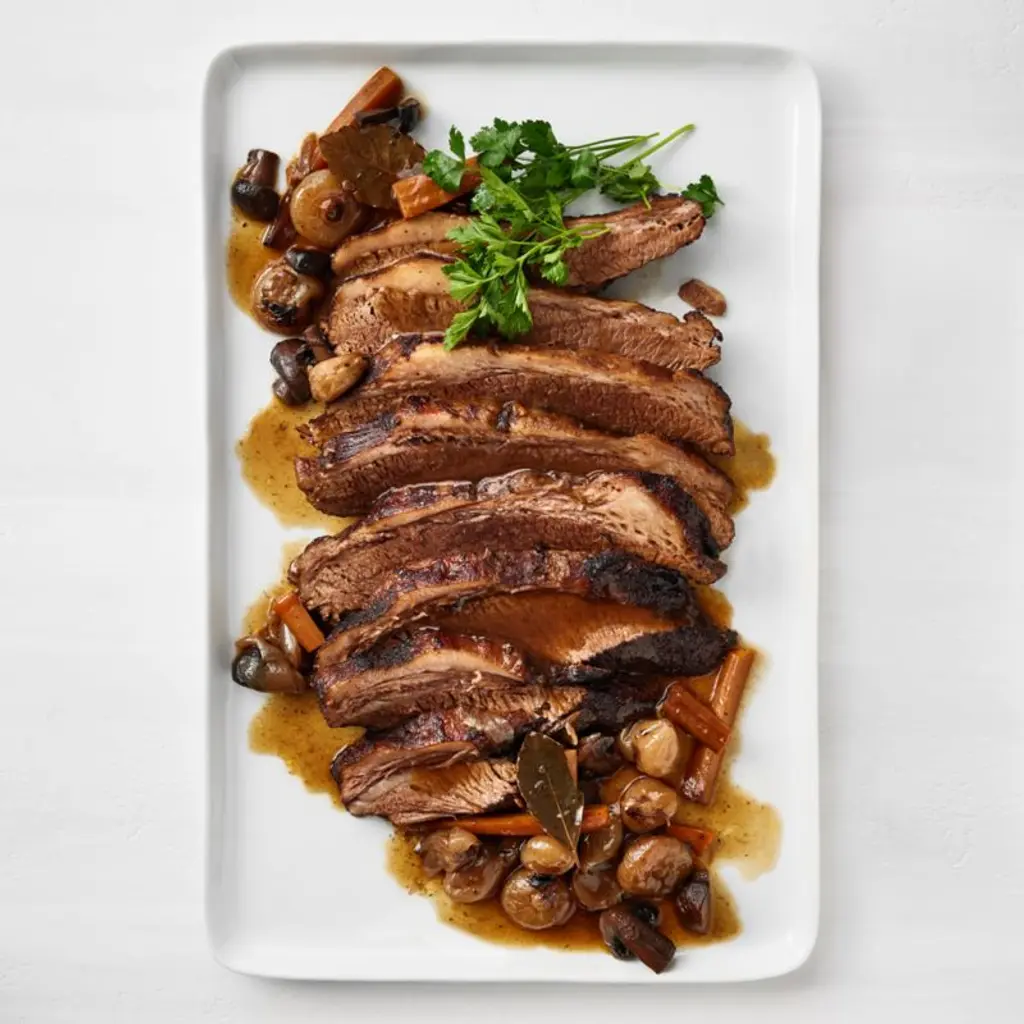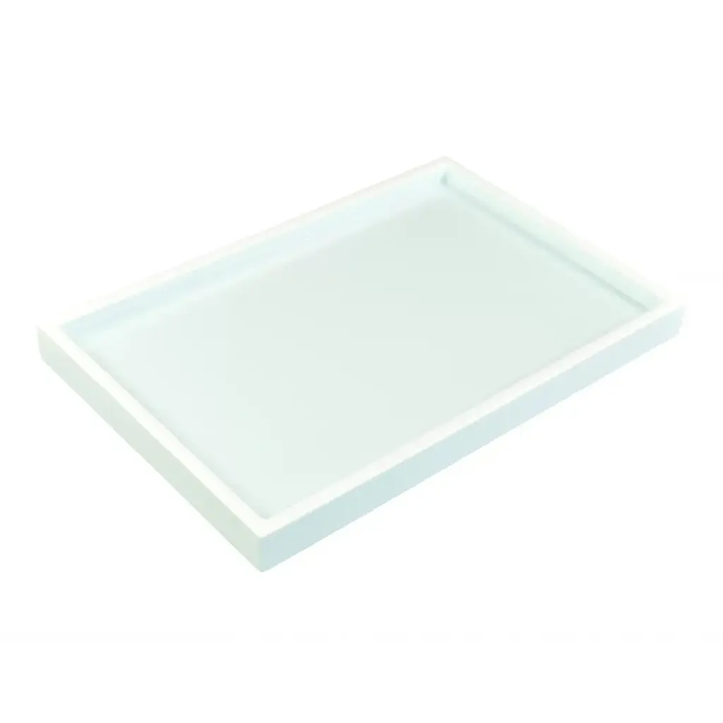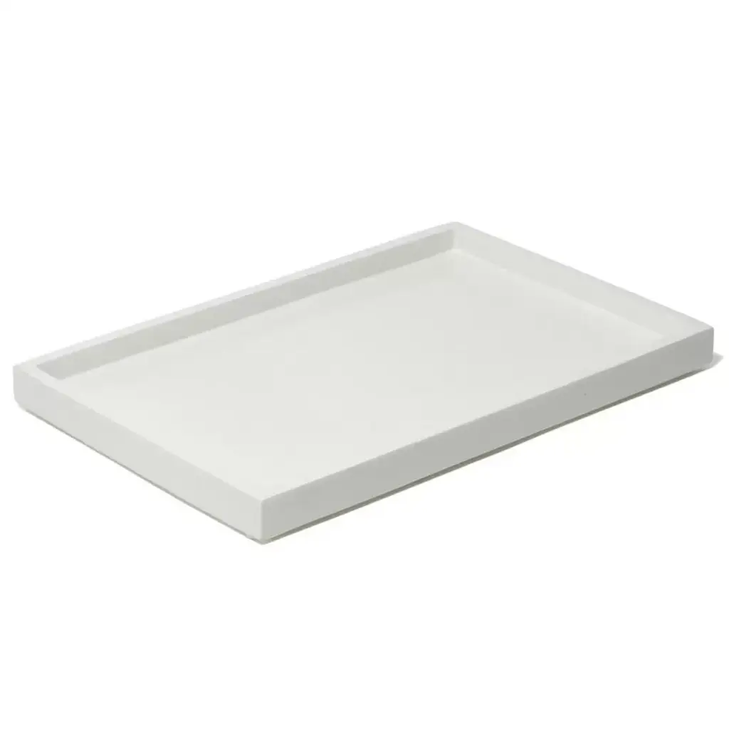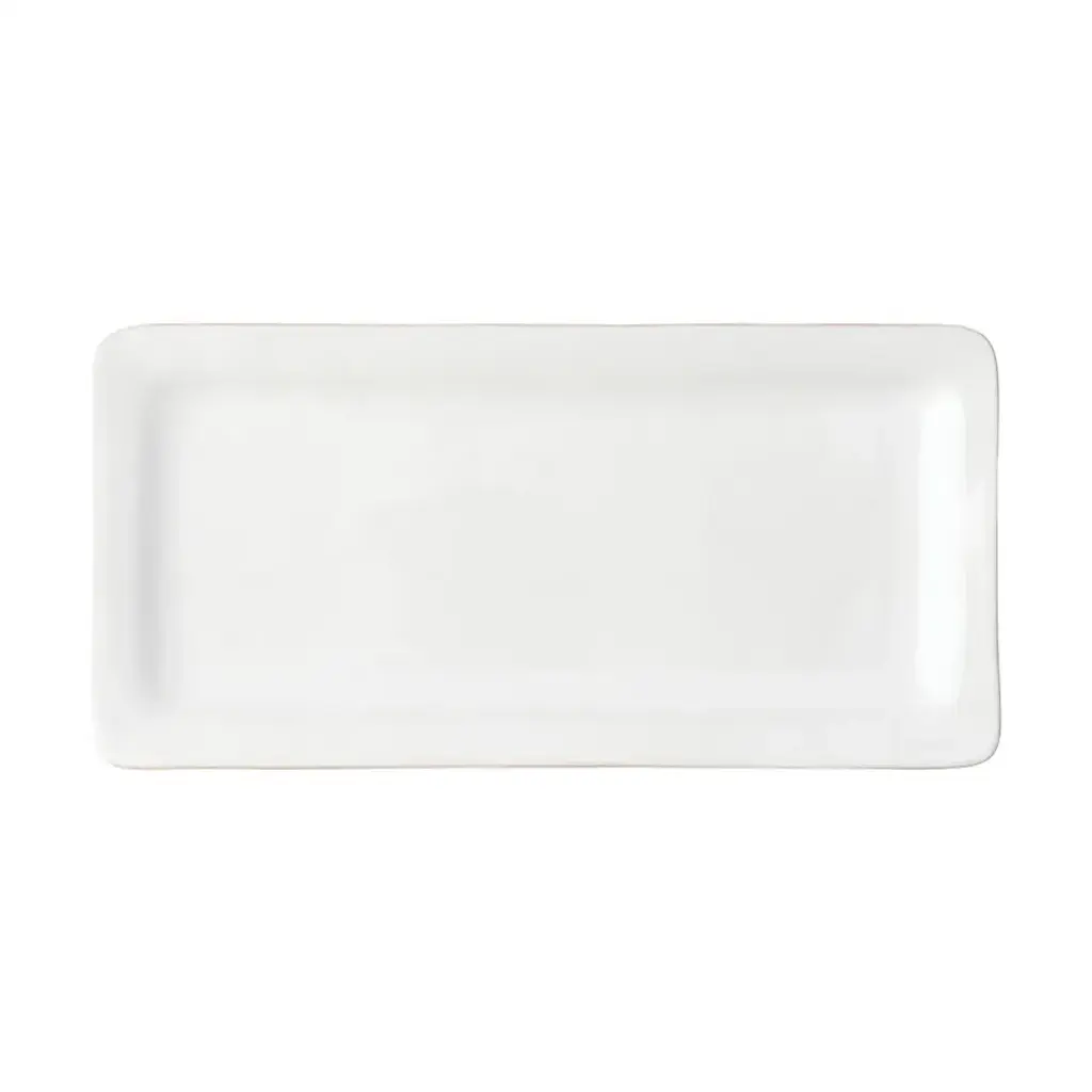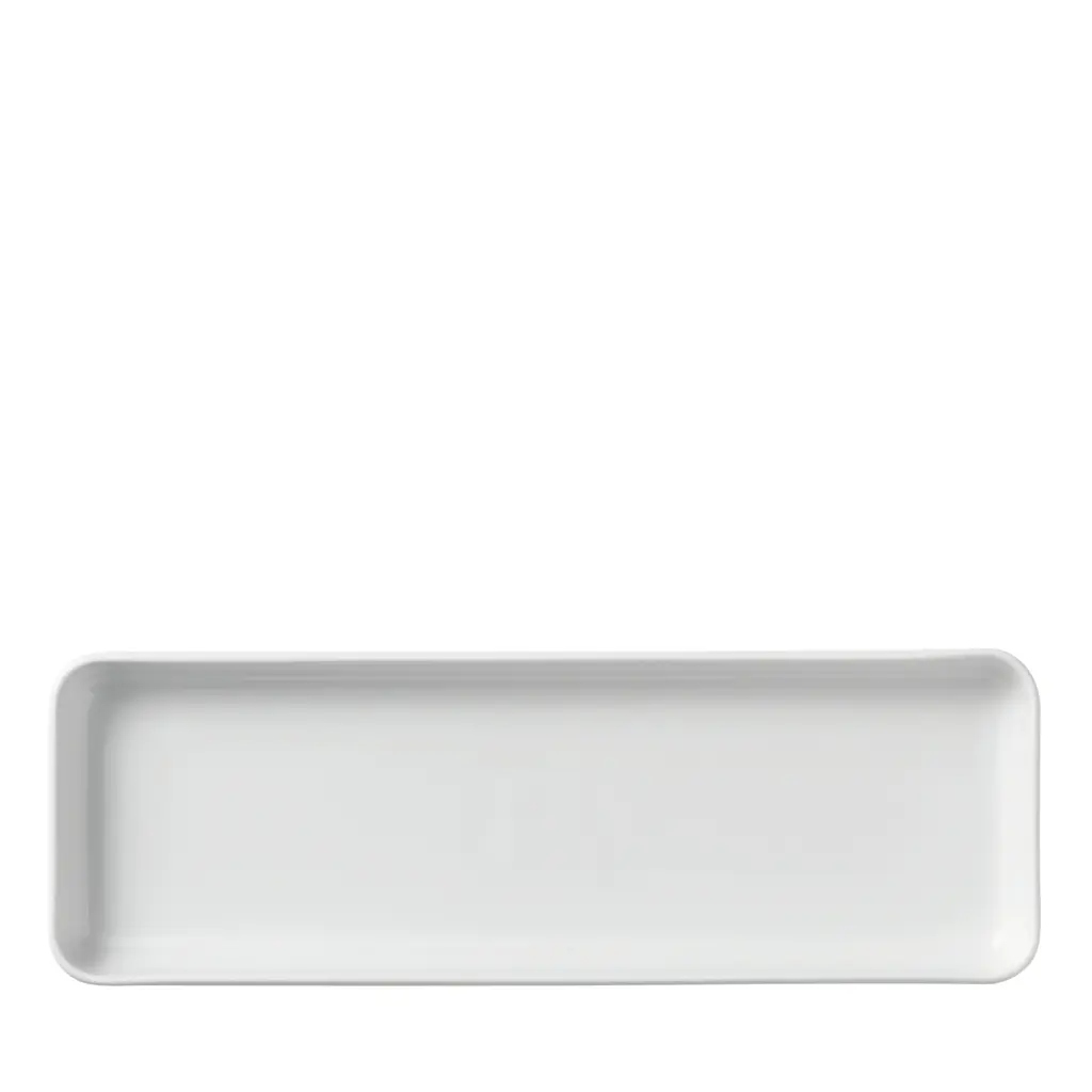 Contemporary porcelain whiteware represents a fusion of refinement and rusticity. The slim profile of this rectangular platter takes on organic overtones with freeform rims and a finely "hammered" surface that ripples the light. Smooth enough to not harm tables, the unglazed ceramic bottom surface gives each serving plate an artisanal look.