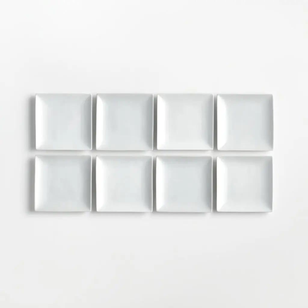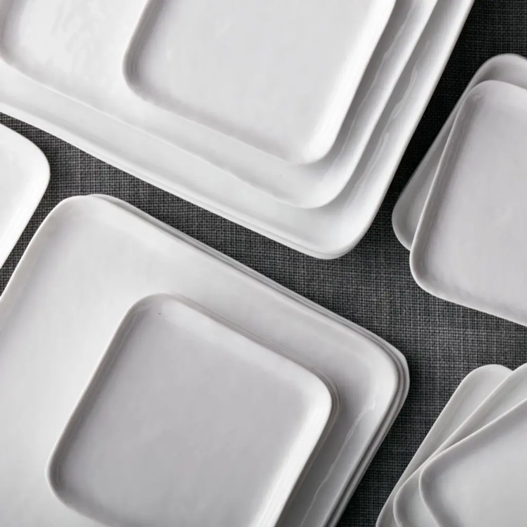 Contemporary porcelain whiteware represents a fusion of refinement and rusticity. The slim profile of this square appetizer plate takes on organic overtones with freeform rims and a finely "hammered" surface that ripples the light. Smooth enough to not harm tables, the unglazed ceramic bottom gives each piece an artisanal look.