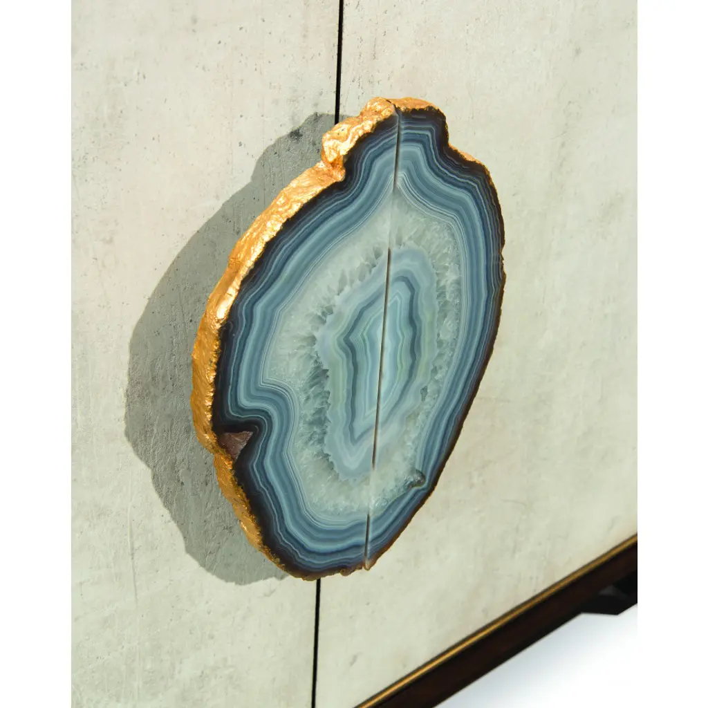 The four drawers and two doors of this credenza are faced in tiza gesso with gold accents, and they are all fitted with agate handles. The case is in American black walnut.