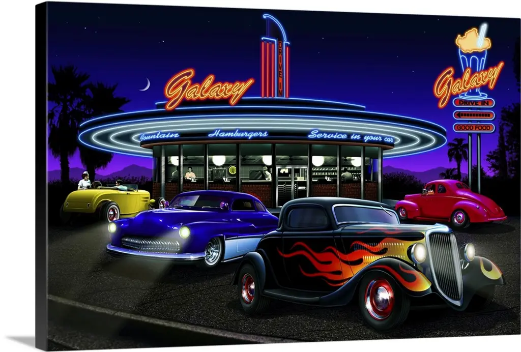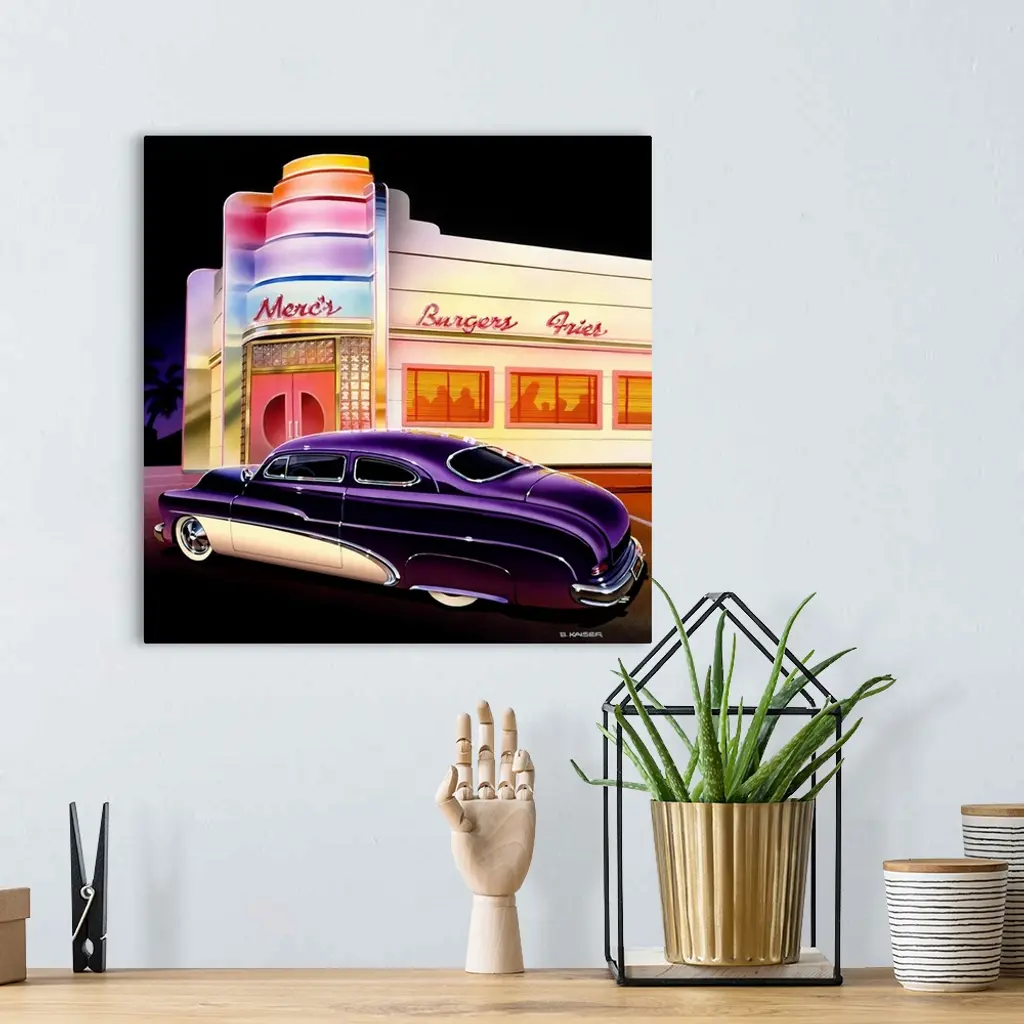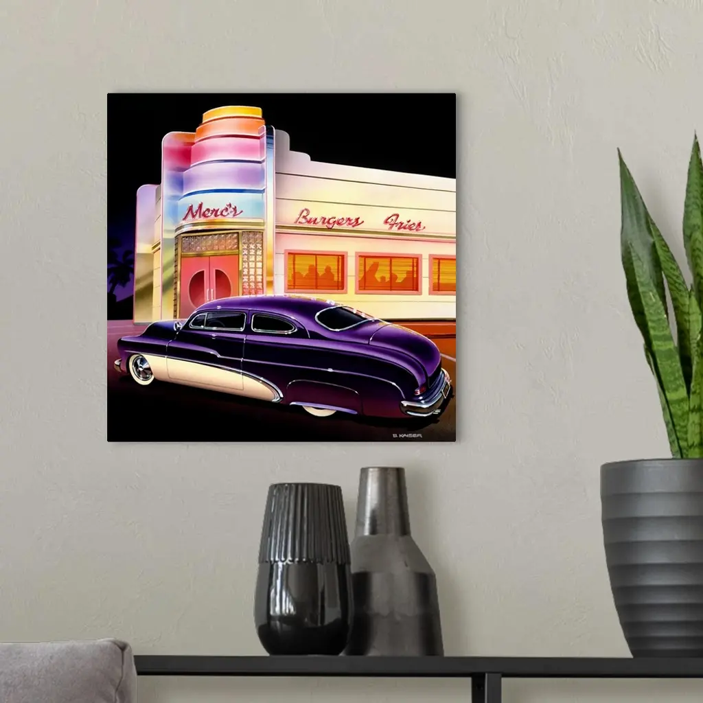 Stylized 50's Miami or Hollywood Burger joint in with a customized 1950 Mercury