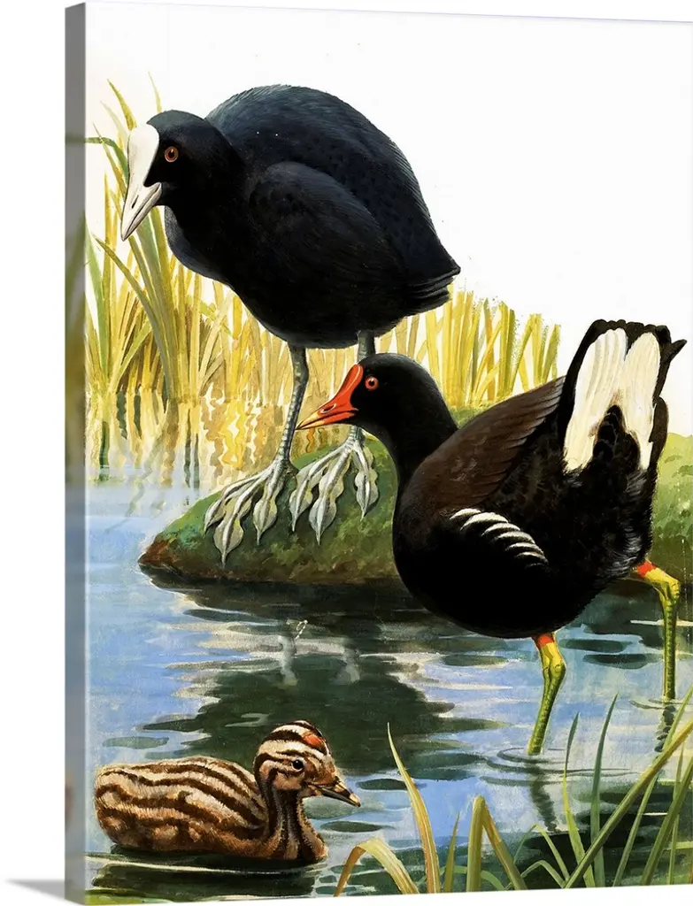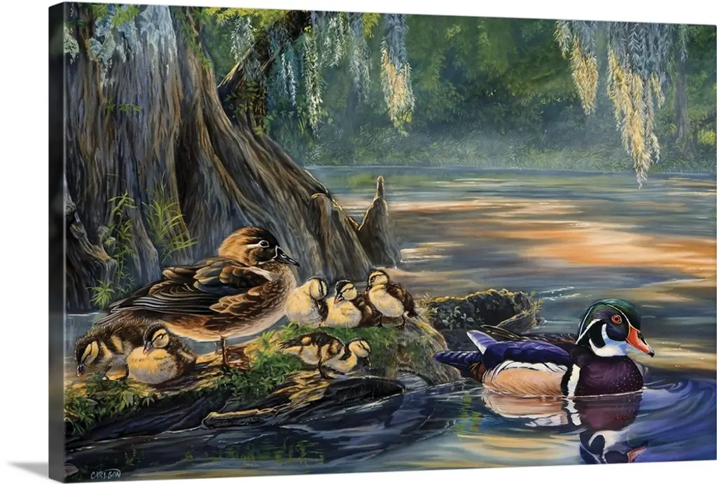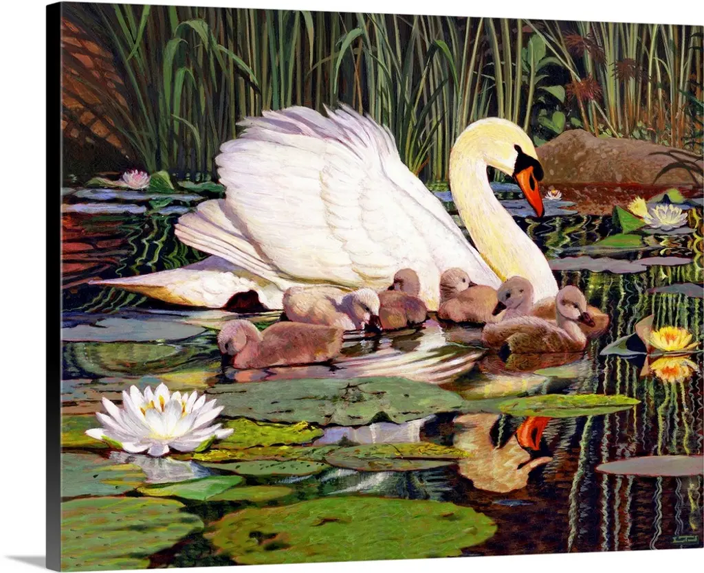 Ducks floating by tall water grass and lily pads.