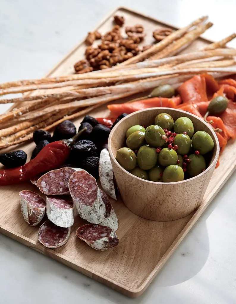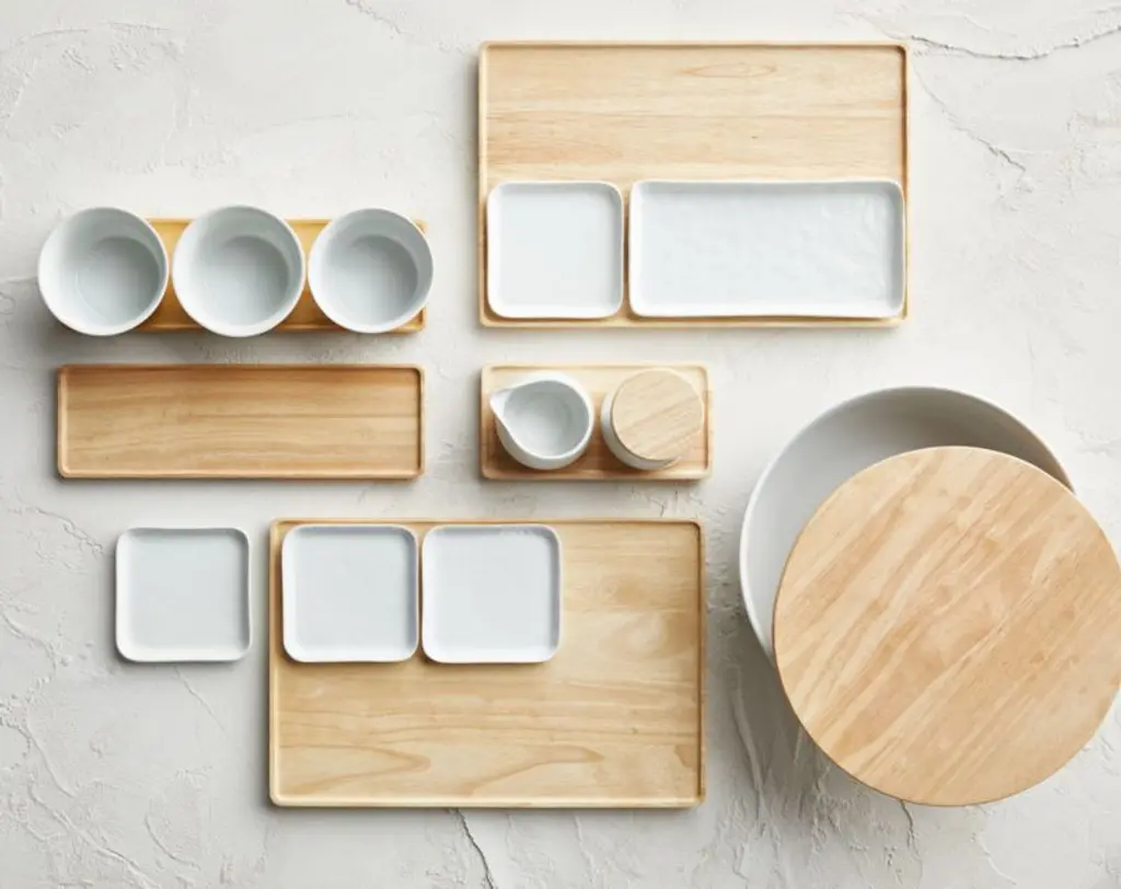 Striking in its simplicity, this natural hardwood tray mixes beautifully with wood or ceramic serving pieces. Its generous dimensions, delicate lip and subtle wood grain present charcuterie, fresh fruit or diminutive desserts with style. For unified entertaining, pair this large wood tray, a Crate & Barrel exclusive, with the cake stand, plates, bowls, coasters and two-tiered server in our Merge collection.By choosing FSC®-certified products, you are supporting responsible management of the world's forests.