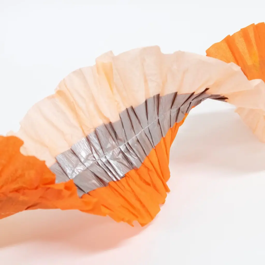 An easy, and effective, way to decorate your Halloween party room is to use a colorful garland. Our designers have created a must-have one made with a stunning trio of orange, shiny silver and peach.