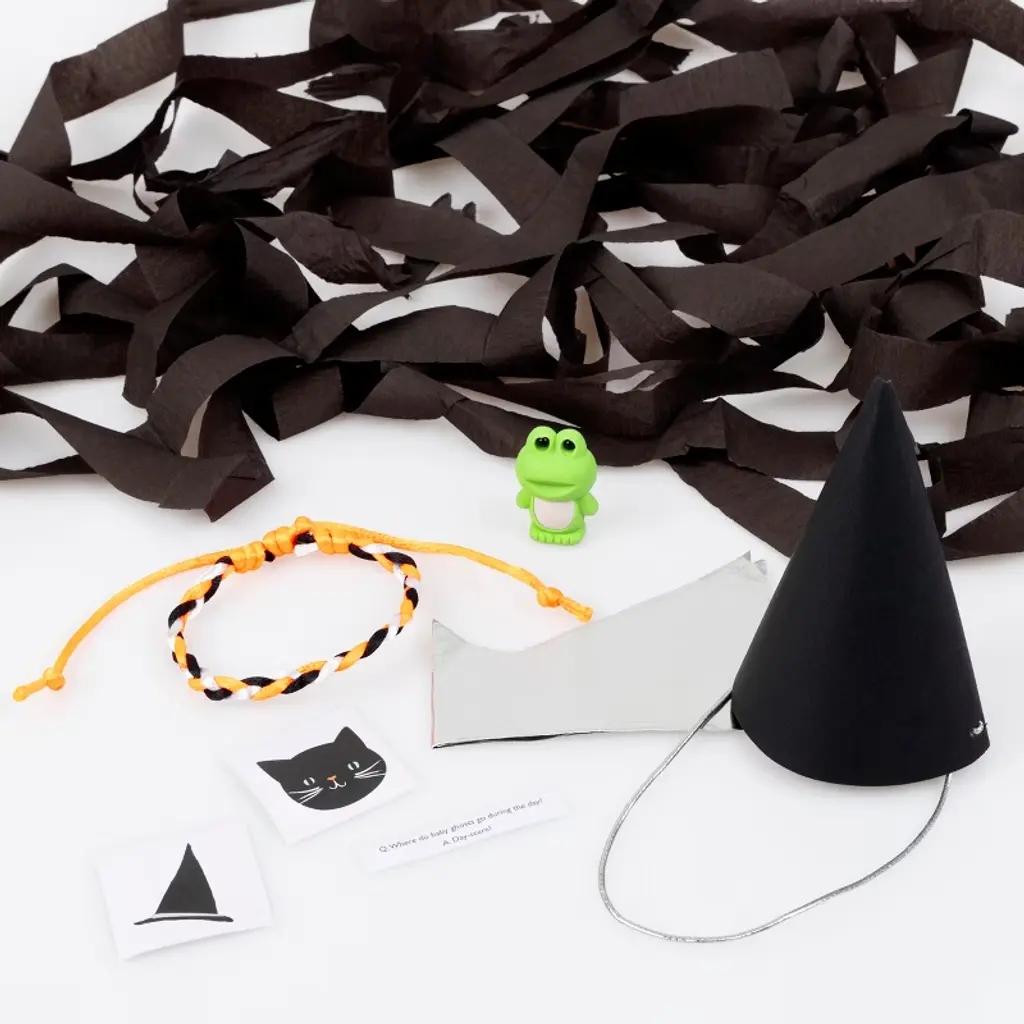 Surprise! These clever Halloween surprise balls are disguised as mini witch hats, each topped with a bow in one of three unique designs. Inside, your guests will discover hidden treasures including two fun stickers, a joke, a silver paper hat, a friendship bracelet and a cute frog eraser. These Halloween party favors are ideal for kids or adults and make a magical addition to your Halloween party supplies. Use them as Halloween table decorations to delight your guests or pop them into Halloween party bags for a spooky surprise they will love. These surprise balls are not only a fun activity but also double as wearable party accessories. They are perfect for photo moments and festive fun too. Suitable for ages 3+.