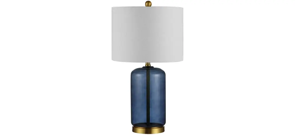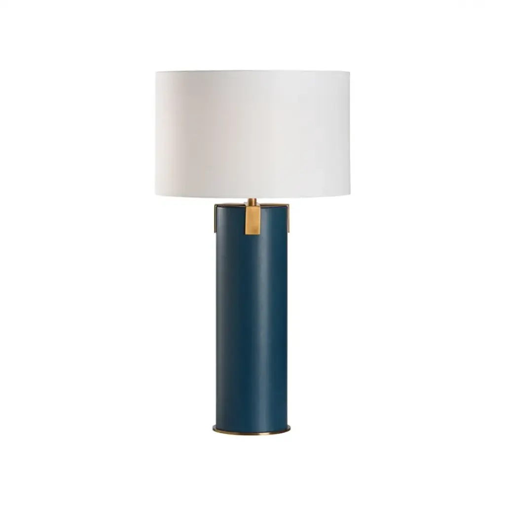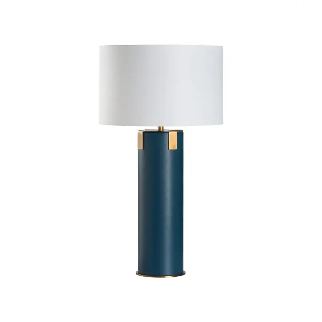 The Meridian Lamp features a sleek cylindrical base wrapped in rich blue leather, accented with antique brass detailing. Sophisticated and tailored, it brings a refined pop of color to any room.