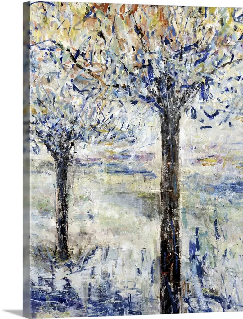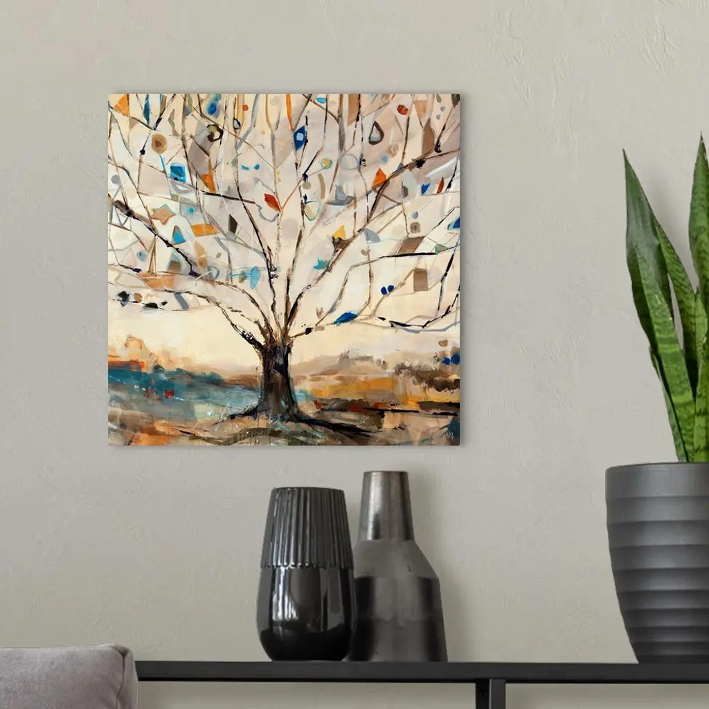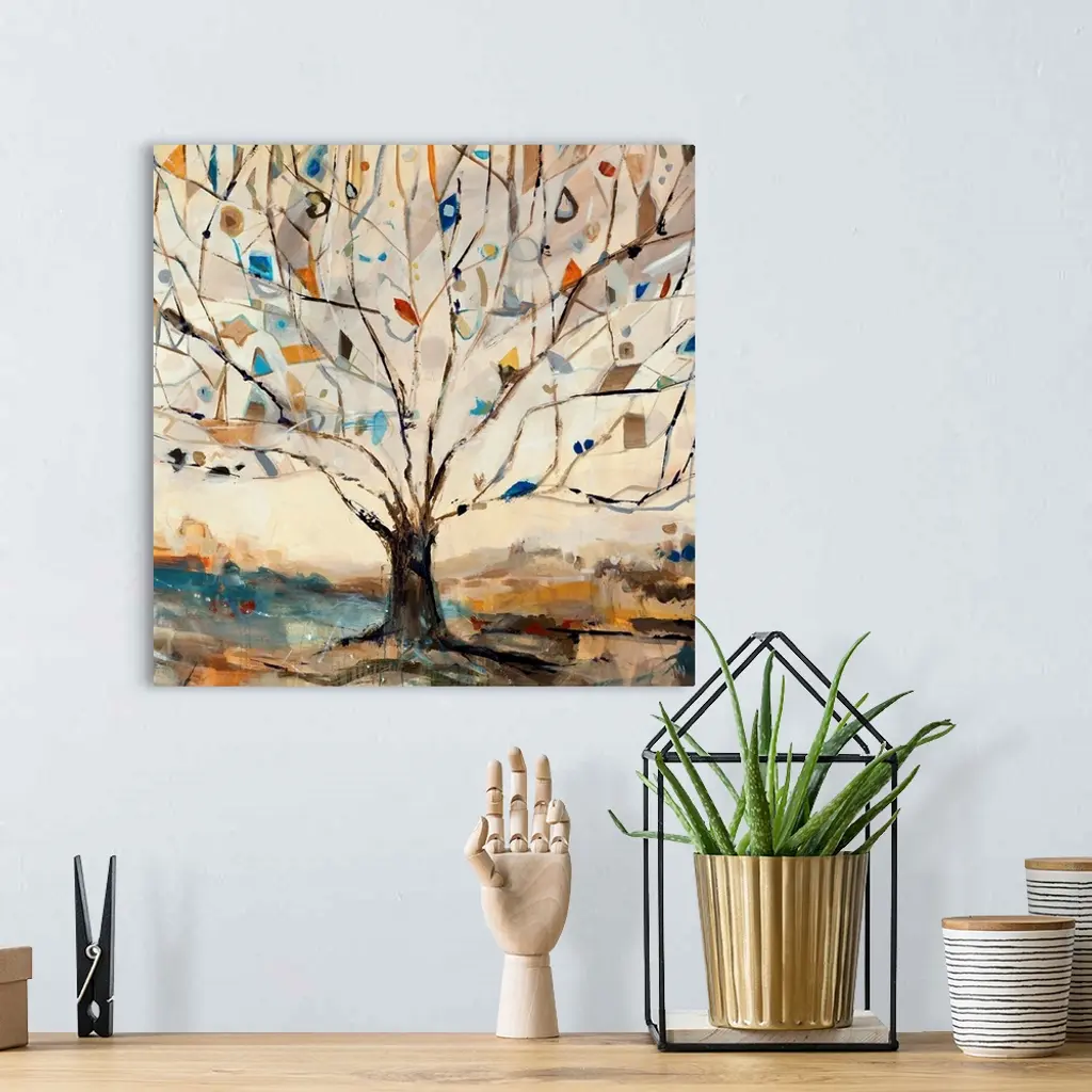 Large square contemporary art displays a Merkaba tree filled with birds that is surrounded by a desolate landscape.