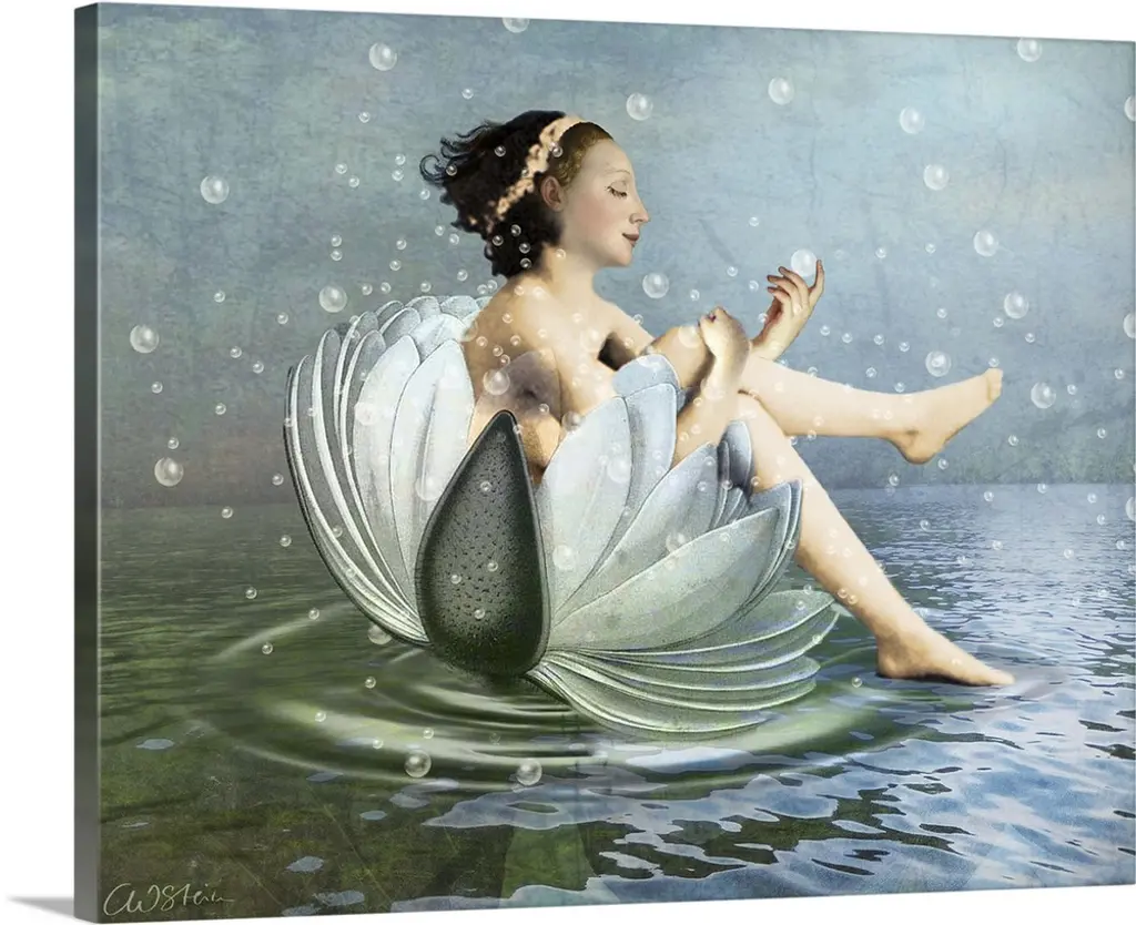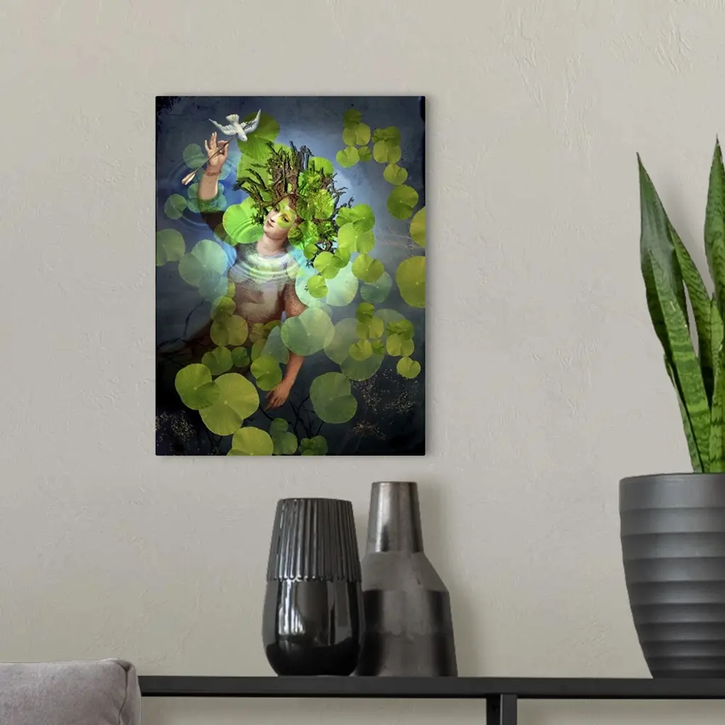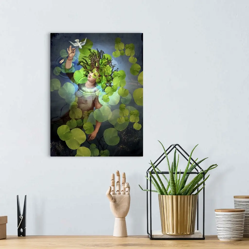 A woman emerging from a pond full of lily pads, with an arrow piercing a bird in her hand.