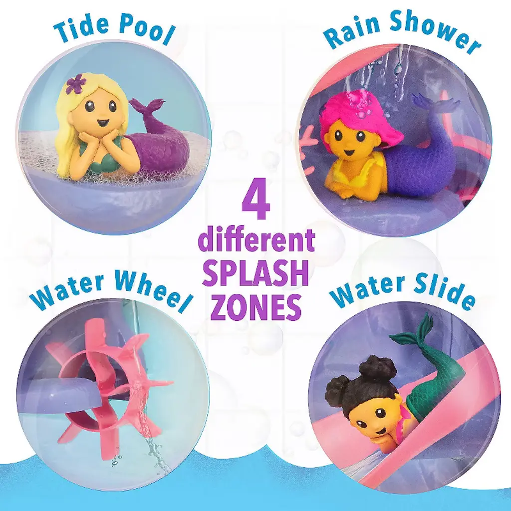 Turn bath time into a magical adventure! This mermaid bath toy set immerses your child in a mystical aquatic world as they glide three mermaid bath toys down the slide and twirl them through the bath water. Watch with delight as the tails on these color changing mermaid bath toys magically change hues as they swim through warm water! Press this playset against the bathtub wall, where suction cups hold it securely in place while your child frolics and plays. They can use the shell cup to pour water into the top of the playset, then change the Splash Zone selector knob to choose where the water goes: into the tide pool for mermaids to lounge in, through the rain shower to offer mermaids a refreshing mist, down the slide to help your mermaid bath toys slip and slide their way into the bath water below or into the water wheel to send it spinning and swirling. This delightful playset not only enchants with its whimsical design but also stimulates young minds by introducing concepts such as cause and effect, gravity and heat. Dive into an ocean of fun as young mermaid fans use this bath toy set to laugh, learn and play time and time again!