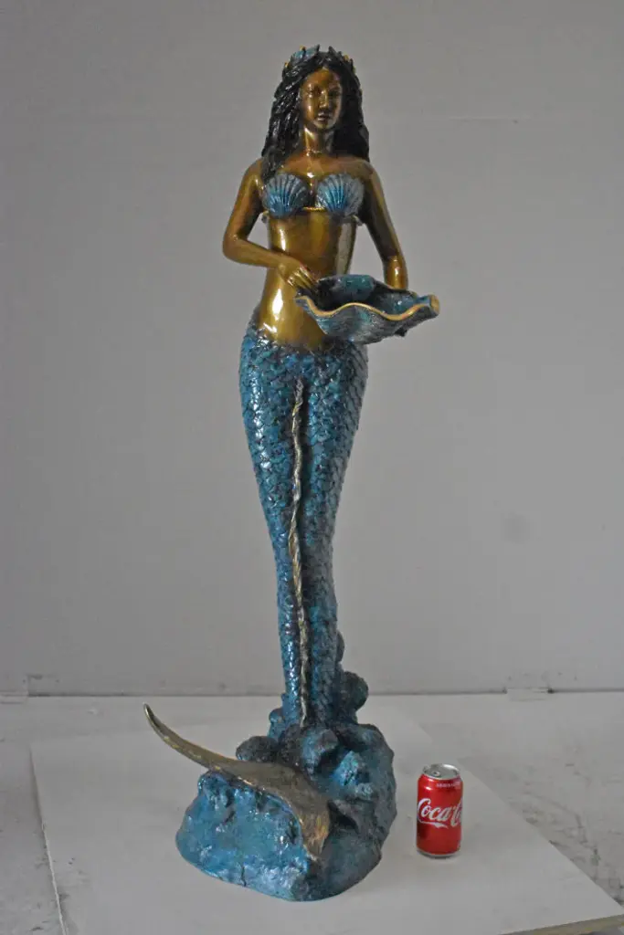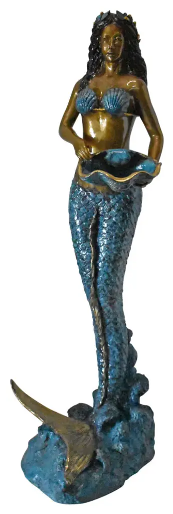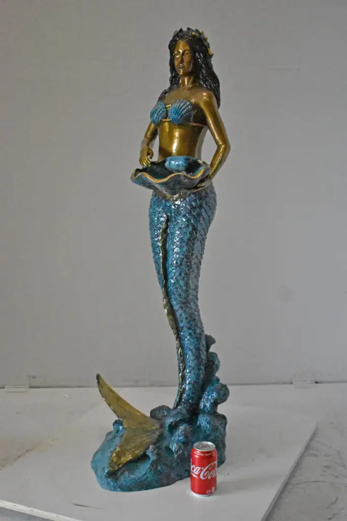 No lover of timeless sea lore and the mysteries of the deep can resist this incredibly detailed Mermaid holding a shell fountain. Water spills from the shell with the help of a water pump (pump is not included). Handcrafted in cast brass and finished with colors deeper than the ocean itself, this breathtaking expression of the world beneath the waves beautifies any space and enhances any decor. . The patina chosen for this Timeless Creation is a mix of hand finishing with different colors and Polychrome techniques also referred to as enameling over bronze, sits on a marble base. This bronze statue is museum quality and hand-cast in high-quality pure bronze using the Lost Wax Process of bronze casting. Size: 18"L x 19"W x 46"H. Weight is: 50Lb