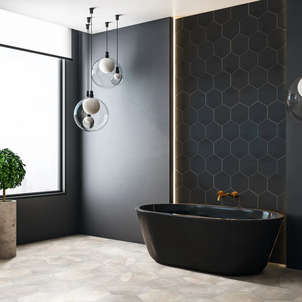 Lending a bold appearance, our Apini Hex Matte Black Porcelain Floor and Wall Tile instantly elevates spaces through a refreshing dose of geometric design. The black glaze is uniformly applied to create a striking matte surface that offers eye-catching beauty. Given the versatility of its format, this hexagon tile is unique yet simplistic enough to integrate into any design, ranging from traditional style renovations to modern home projects. Its impervious, frost resistant and durable features make this an ideal tile for residential indoor and outdoor use, including kitchen backsplashes, bathroom showers, and fireplace facades. This tile is a perfect choice on its own or paired with other products in the Apini Collection. Tile is the better choice for your space. This tile is made from natural ingredients, making it a healthy choice as it is free from allergens, VOCs, formaldehyde and PVC. 7.14 square feet, 14 pieces per case. Case weight is 34.88 lbs. Grade 1, first-quality porcelain tile for floor and wall use 9.13 in. width x 10.5 in. length x 0.39 in. thick Glazed, medium textured finish with a low sheen and uniform appearance in tone PEI Rating II is suitable for all interior walls and light foot traffic such as powder rooms Impervious tiles have a water absorption of less than 0.5% for indoor and outdoor use and are frost resistant This tile is ADA approved for slip resistance with a DCOF value of 0.42 or higher. Completely frost resistant for indoor or outdoor applications; use a latex-modified thinset for acceptable bond strength Please note: A sample of this product may be a partial piece cut from the full size tile in order to provide an affordable and convenient way for customers to judge the quality and finish of this item. Samples are not returnable.